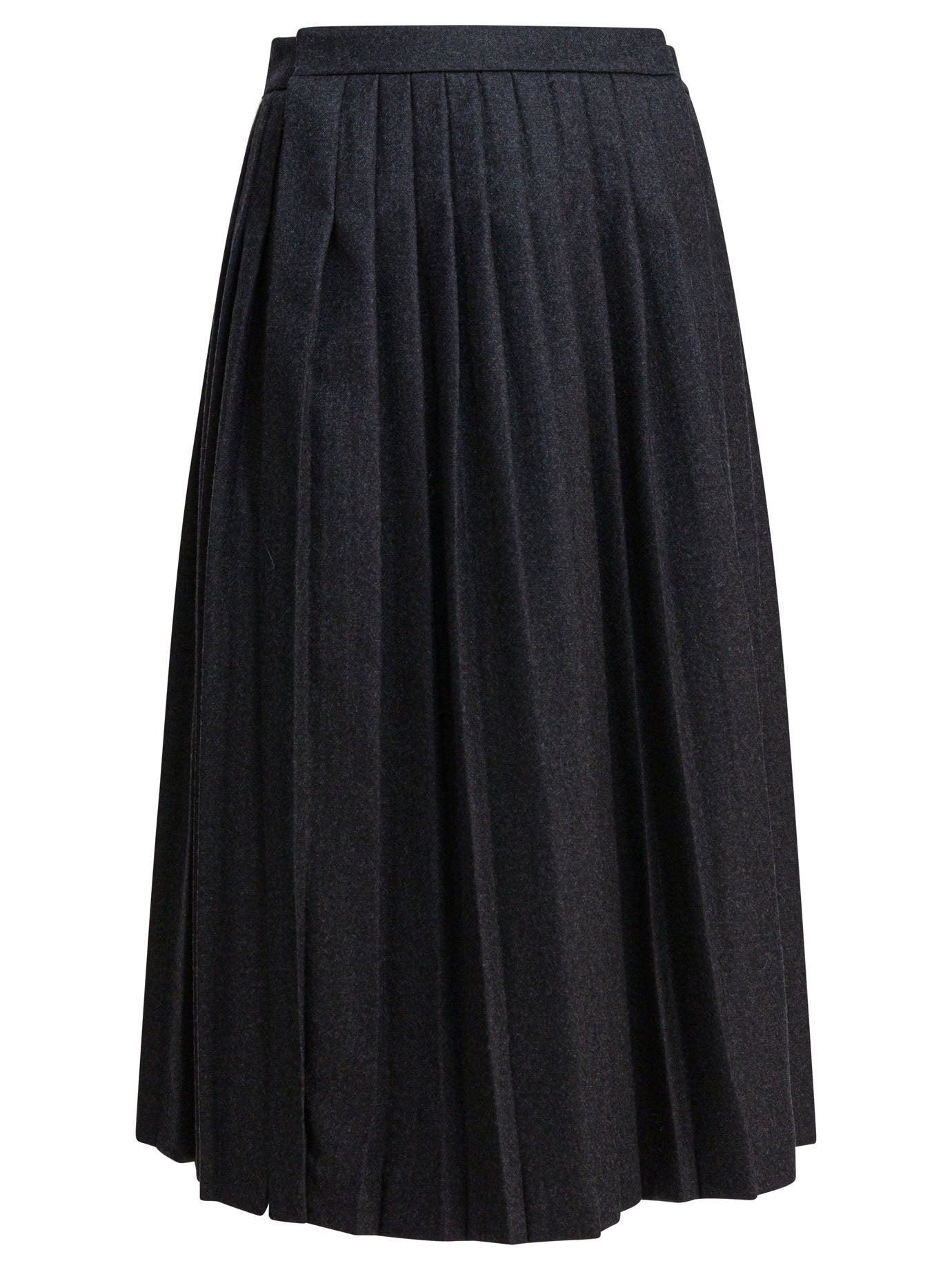 Prada Wool flannel pleated skirt. Wrap-around construction in pure wool flannel with regular pleats along the entire length. The structure features a slightly flared silhouette. Integrated front slit and covered snap closure positioned at front. Seams are finished to match the fabric. The main fabric is natural and free of synthetic blends.