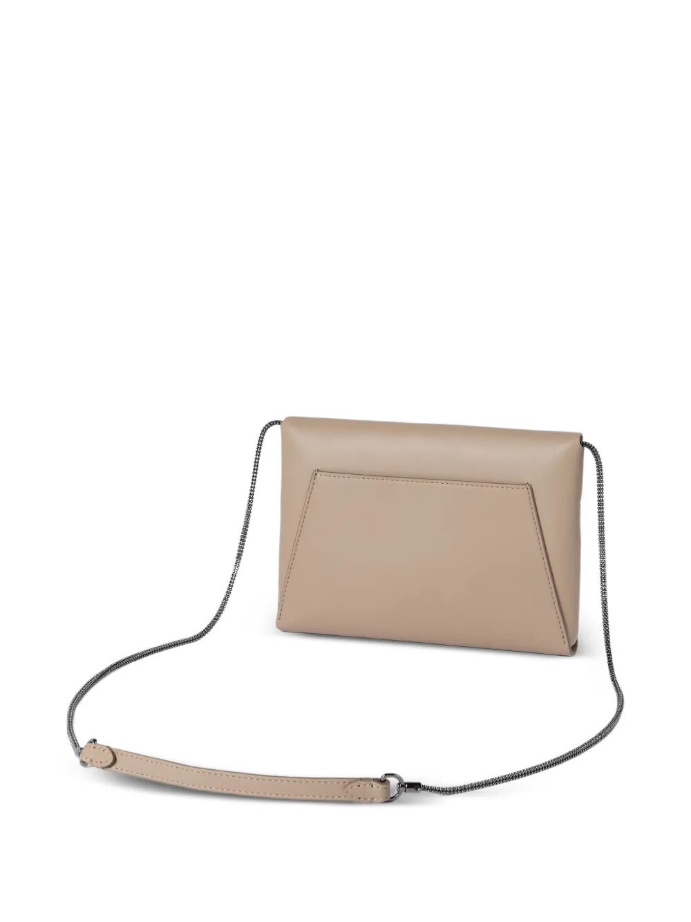 Introducing the Brunello Cucinelli Pochette BC Duo, a sophisticated envelope-style crossbody bag crafted from luxurious vitello leather. This elegant pochette features a precious chain strap that allows for versatile wear as a crossbody or shoulder bag, making it perfect for both day and evening occasions.