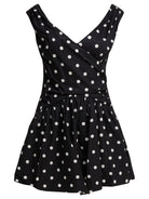 Self-portrait polka-dot flared dress features a off-shoulder construction and fitted silhouette at the top. Features ruffles at the waist that define the structure and create a transition to a flared skirt. The closure is with a concealed back zipper. The fabric offers minimal stretch and a regular fit. Ruffled detail at the waist emphasizes the low line.