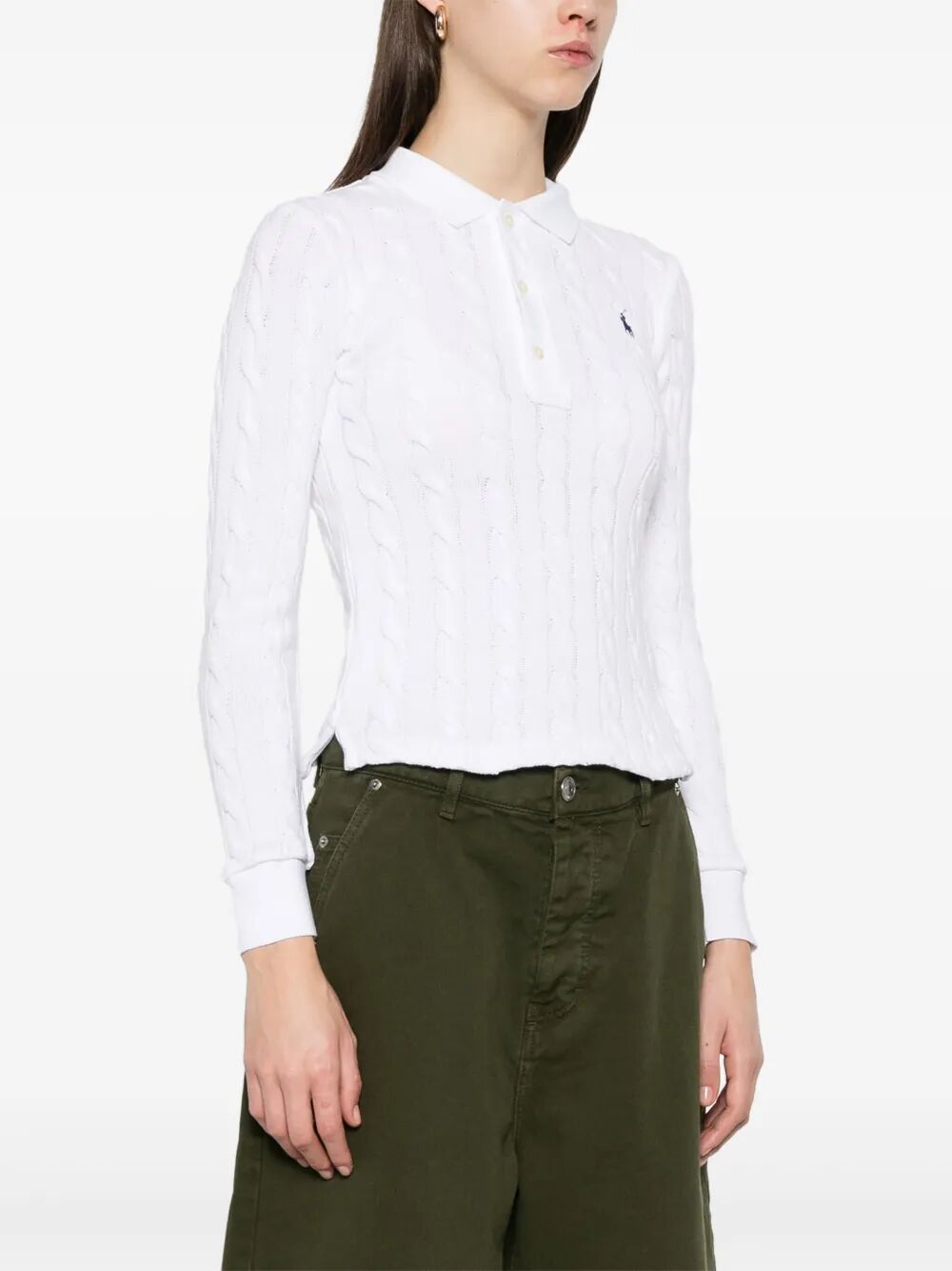 THIS COTTON CABLE-KNIT POLO BLENDS CASUAL REFINEMENT WITH A TEXTURED, TIMELESS DESIGN. ITS LONG SLEEVES AND SHAPED SILHOUETTE OFFER A POLISHED FIT, WHILE THE SIGNATURE EMBROIDERED PONY ELEVATES THE LOOK WITH A CLASSIC POLO RALPH LAUREN TOUCH.