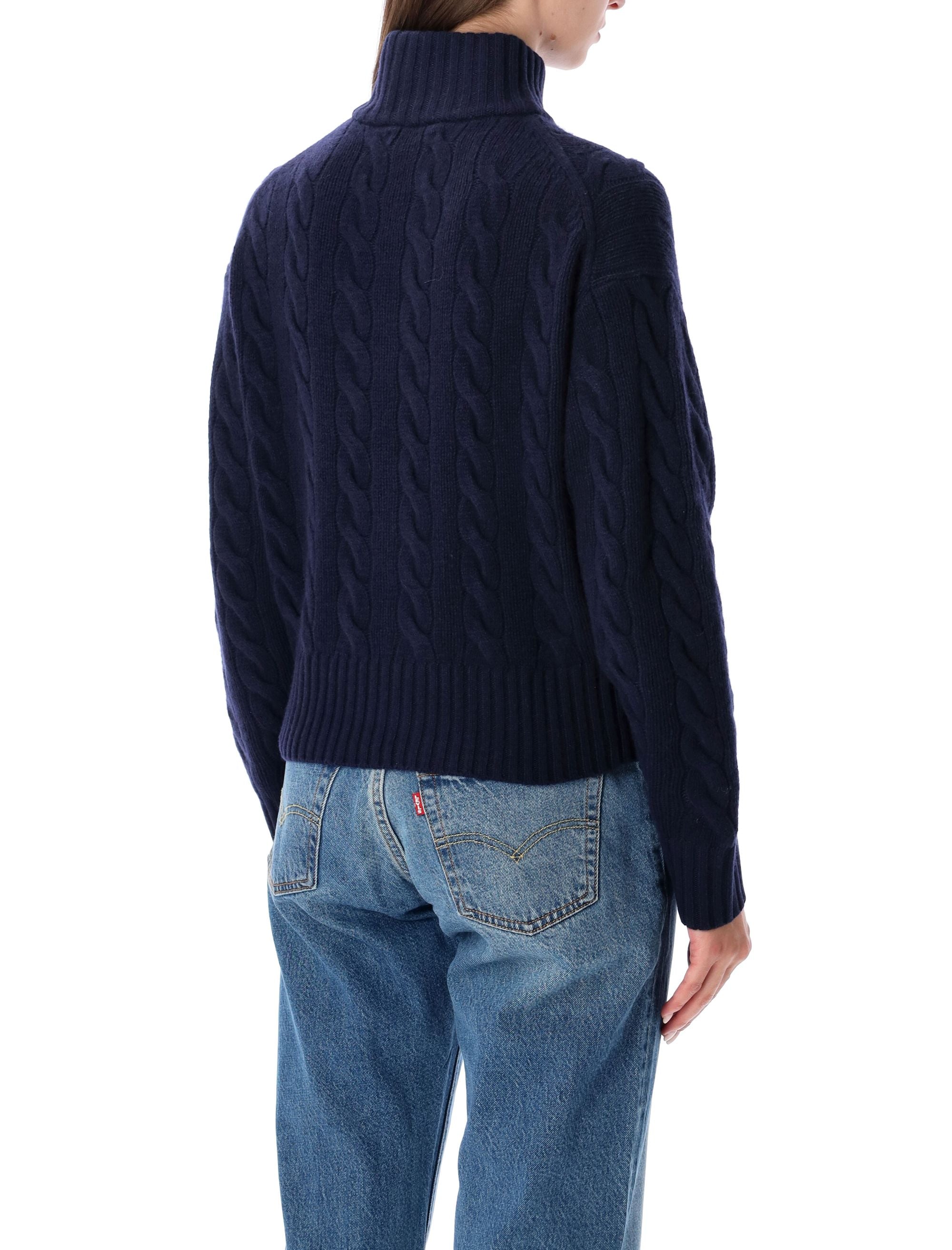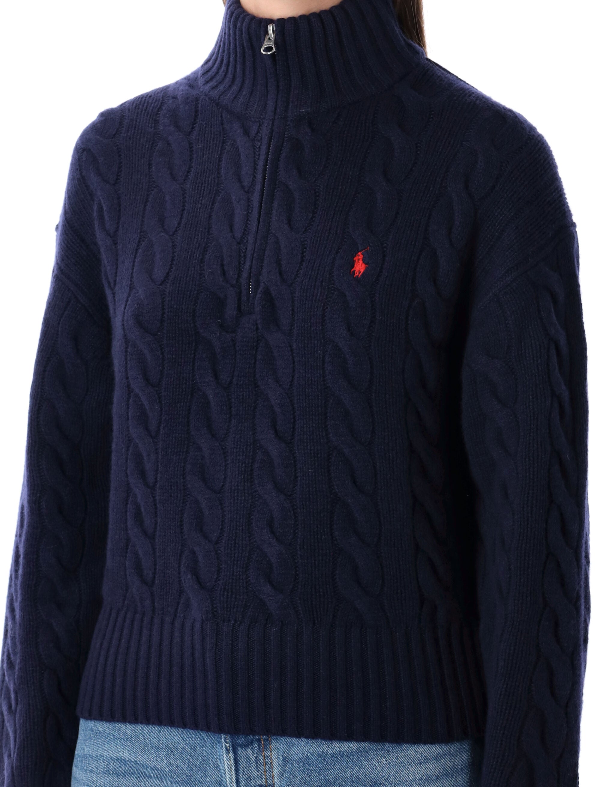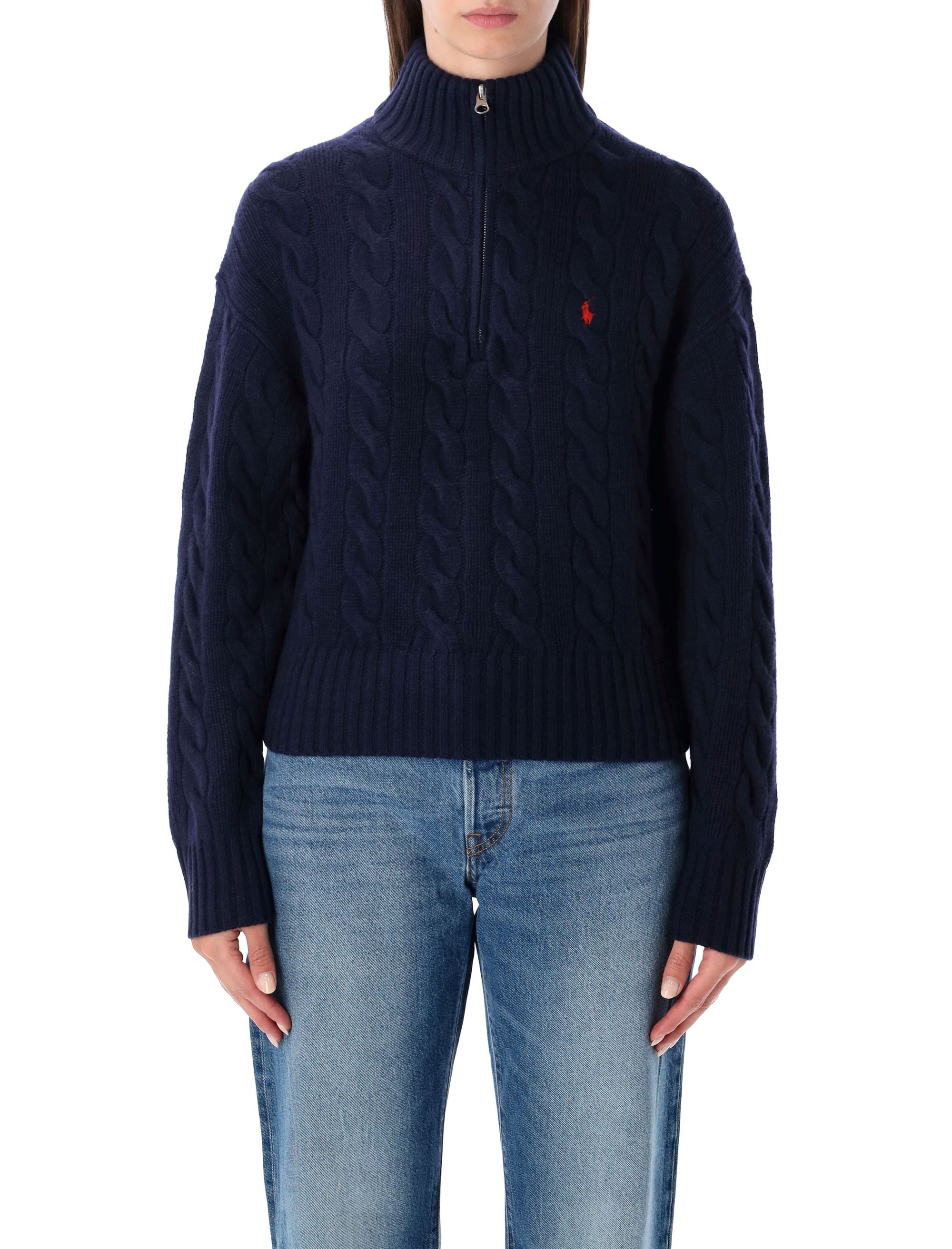 KNITTED FROM A SUMPTUOUS WOOL AND CASHMERE BLEND, THIS POLO RALPH LAUREN SWEATER SHOWCASES THE BRAND’S SIGNATURE CABLE-KNIT PATTERN FOR A REFINED, TEXTURAL APPEAL. THE HIGH COLLAR WITH HALF-ZIP CLOSURE OFFERS VERSATILE STYLING, WHILE THE RIBBED TRIMS ENSURE A NEAT, STRUCTURED FIT. FINISHED WITH THE ICONIC EMBROIDERED PONY ON THE CHEST, THIS SWEATER DELIVERS TIMELESS ELEGANCE AND COSY WARMTH FOR COOLER DAYS.