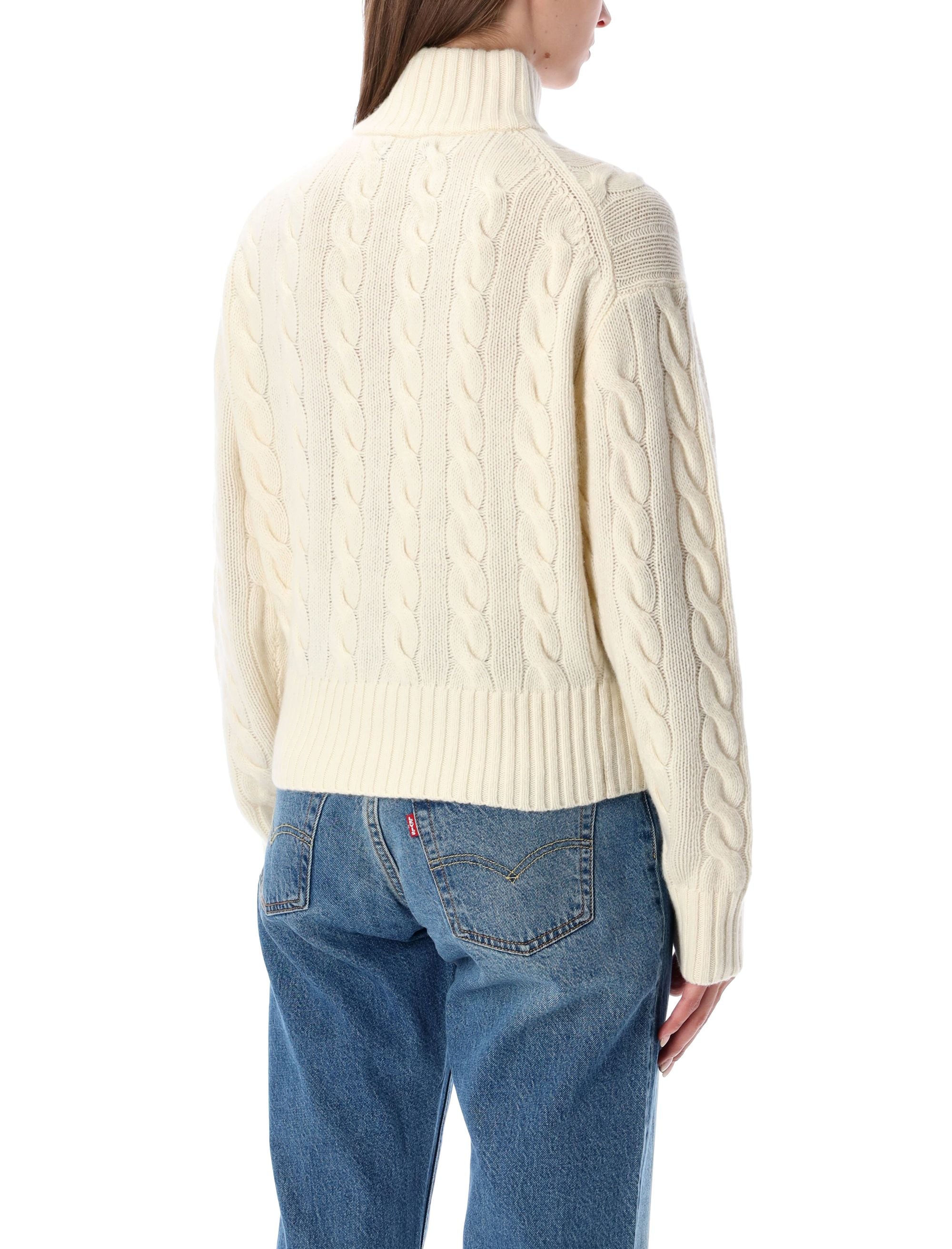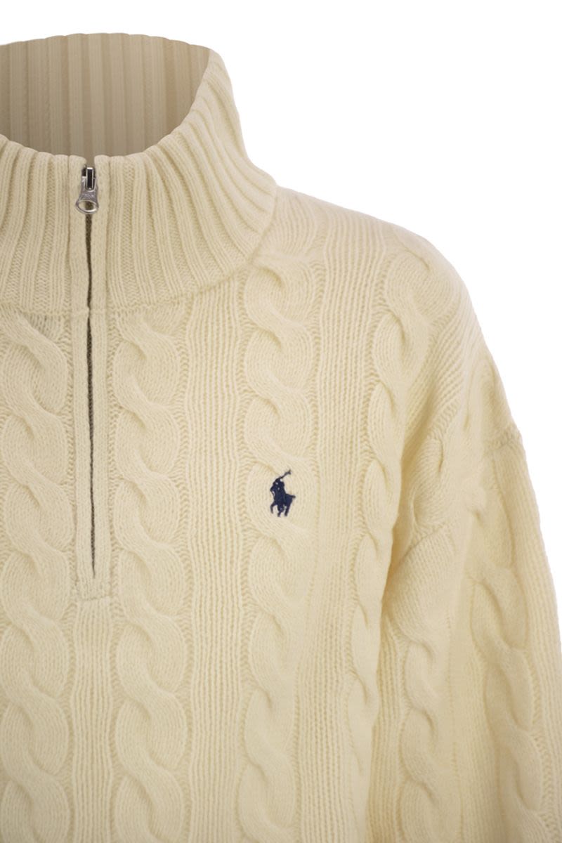 KNITTED FROM A SUMPTUOUS WOOL AND CASHMERE BLEND, THIS POLO RALPH LAUREN SWEATER SHOWCASES THE BRAND’S SIGNATURE CABLE-KNIT PATTERN FOR A REFINED, TEXTURAL APPEAL. THE HIGH COLLAR WITH HALF-ZIP CLOSURE OFFERS VERSATILE STYLING, WHILE THE RIBBED TRIMS ENSURE A NEAT, STRUCTURED FIT. FINISHED WITH THE ICONIC EMBROIDERED PONY ON THE CHEST, THIS SWEATER DELIVERS TIMELESS ELEGANCE AND COSY WARMTH FOR COOLER DAYS.