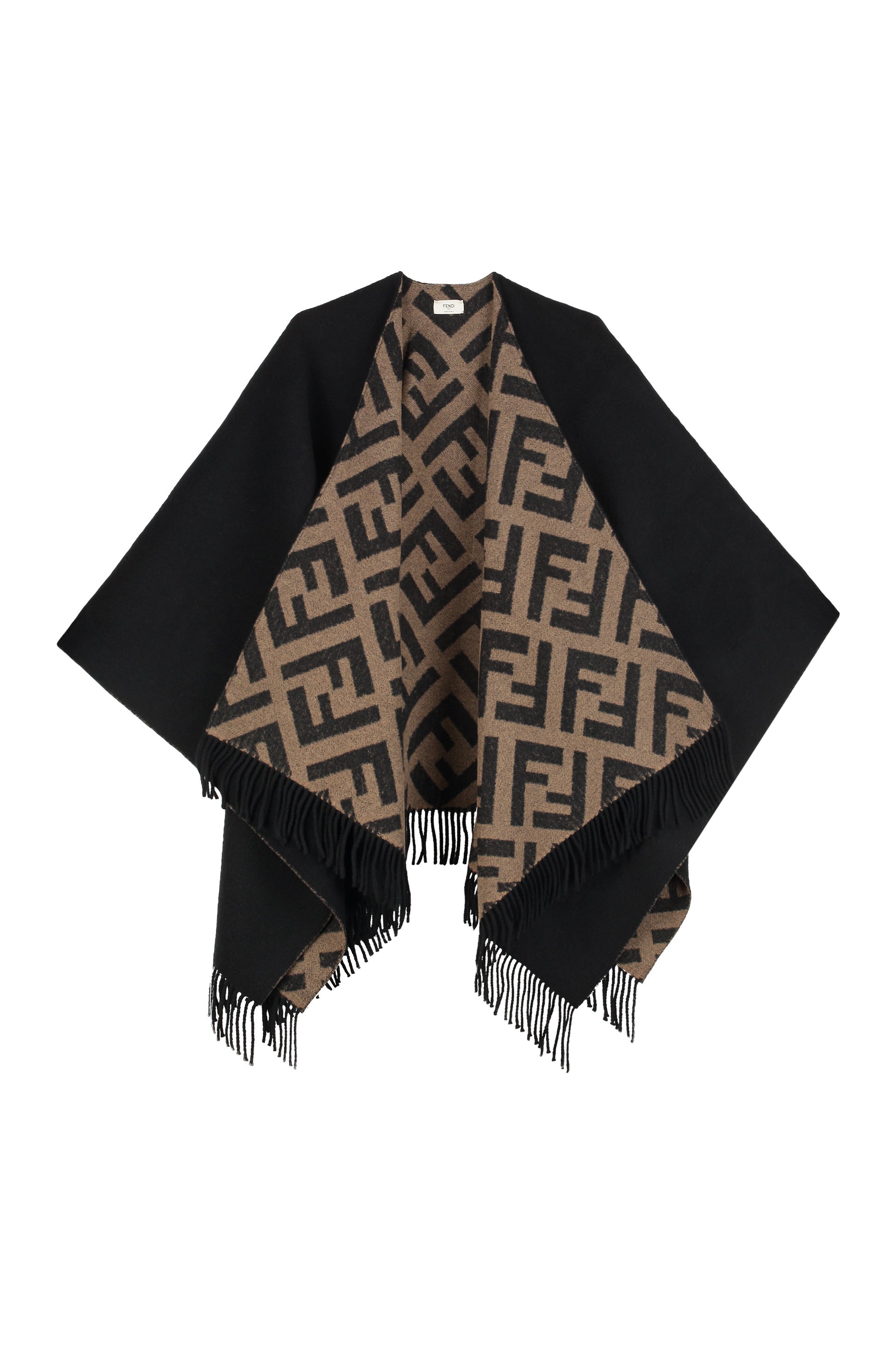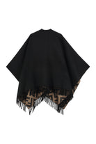 REVERSIBLE PONCHO WIDE AND ENVELOPING. ONE SIDE IS CUSTOMIZED WITH A MACRO FF PATTERN IN SHADES OF BROWN, THE OTHER IS SOLID BLACK. FINISHED WITH FRINGES AT THE BOTTOM.