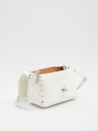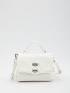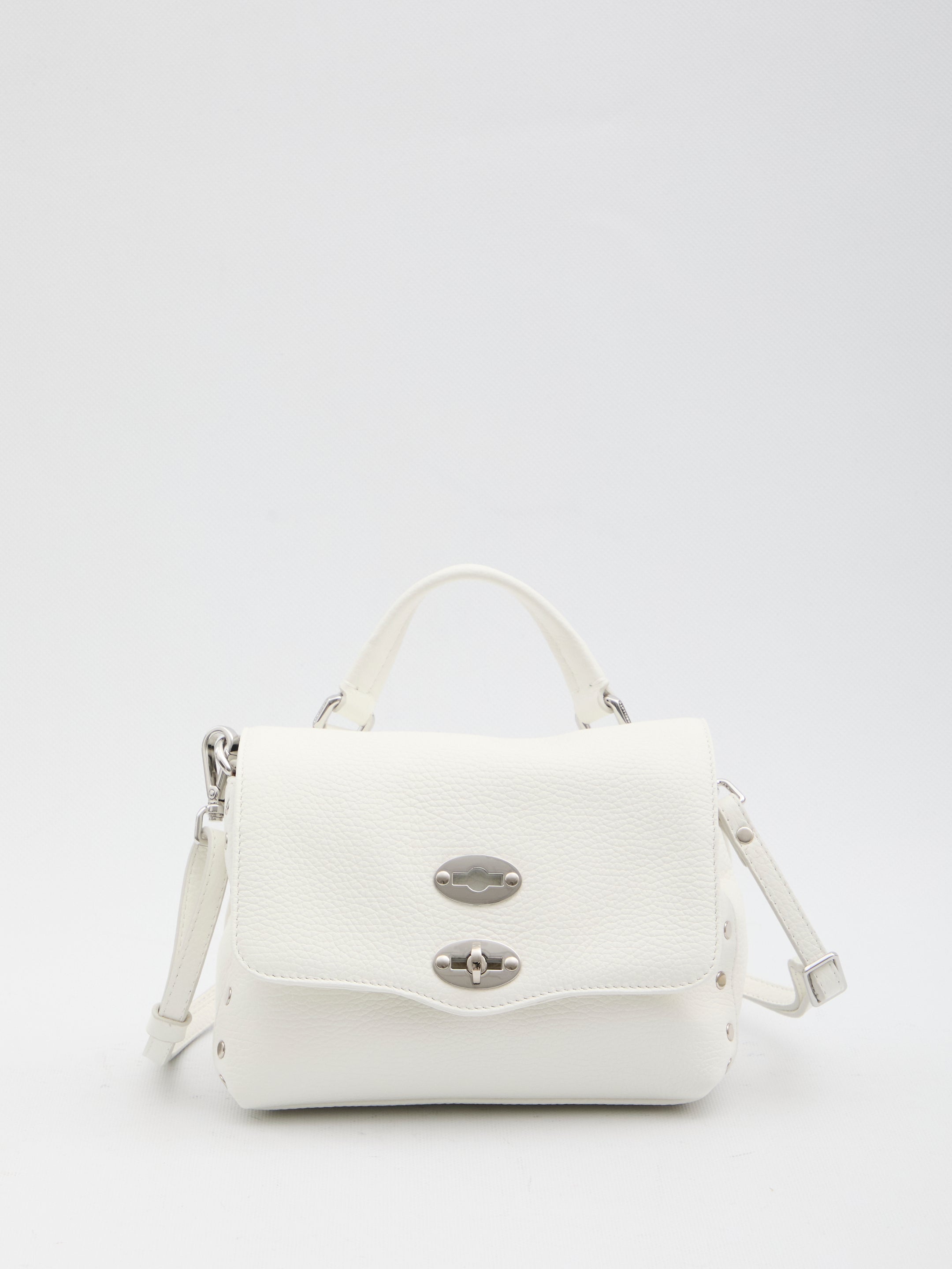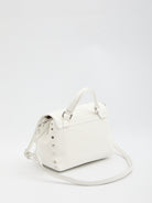 Milk white hammered calf leather bag. It features a fixed top handle, an adjustable and removable shoulder strap, a double turn-lock closure, metal feet, one main compartment, one internal flat pocket, and a cotton lining. Dustbag included. Any imperfections in the leather are not to be considered manufacturing defects, but a characteristic of the material.