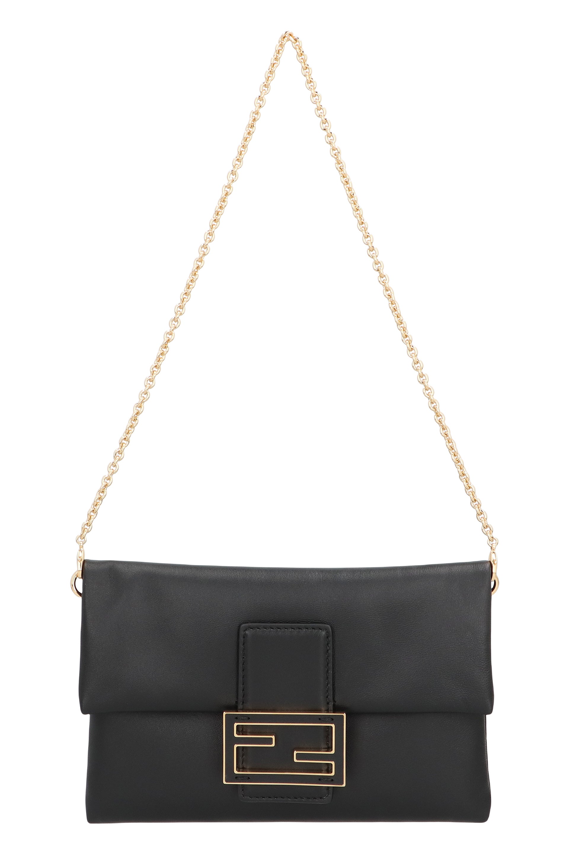 POUCH WITH SOFT FLAP, DECORATED WITH FF CLOSURE WITH TONE-ON-TONE LEATHER INSERT. LINED INTERIOR. CAN BE CARRIED BY HAND OR ON THE SHOULDER THANKS TO THE COMFORTABLE LEATHER WRIST STRAP AND THE REMOVABLE CHAIN SHOULDER STRAP. MADE OF SOFT BLACK NAPPA LEATHER. METALLIC ACCESSORIES WITH GOLD FINISH.