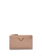 Elevate your everyday essentials with this exquisite Powder Pink Leather Card Holder from Prada. Crafted from luxurious Saffiano leather, this sleek accessory features the iconic triangular logo plaque in gleaming gold-tone hardware.