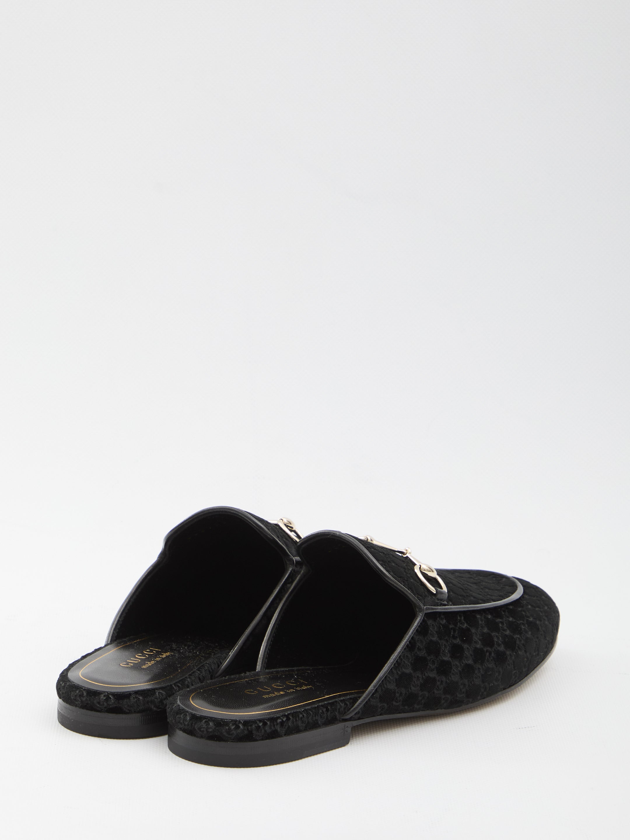 Black velvet slippers with all-over GG Monogram. Featuring a light gold-tone horsebit, leather insole, and sole. Dustbag included. Any irregularities in the leather are not to be considered factory defects, but a characteristic of the material.