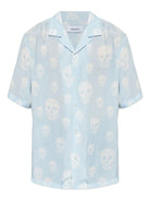 Make a bold statement with this Alexander McQueen Printed Hawaiian Shirt in a serene light blue hue adorned with an all-over white skull motif. This distinctive piece combines the relaxed silhouette of a classic Hawaiian shirt with McQueen's signature edgy aesthetic, creating a perfect balance between casual comfort and high-fashion attitude.