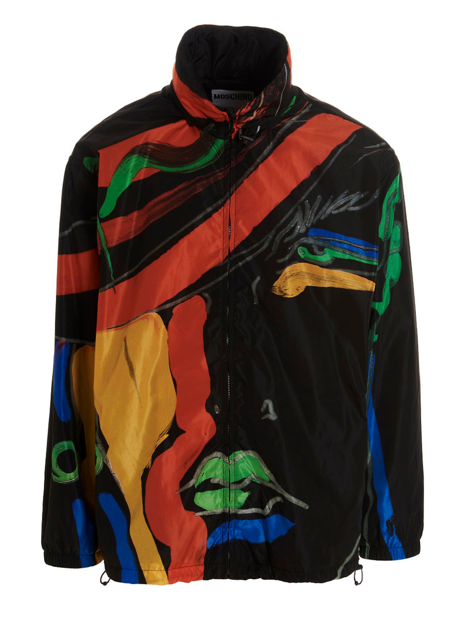 Make a bold statement with this Moschino printed nylon jacket featuring an eye-catching all-over artistic face print in vibrant colors. This lightweight yet functional piece combines high-fashion aesthetics with practical details including a pull-out hood, zip closure, and convenient pockets.