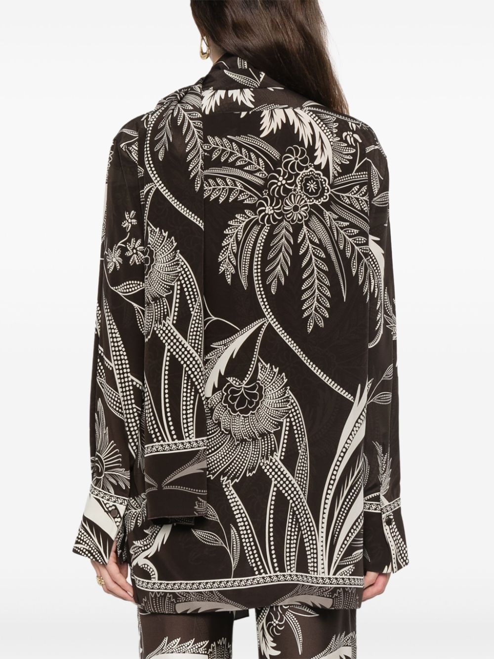 BROWN/WHITE SILK SATIN FINISH BOTANICAL PRINT PIPED-TRIM DETAILING BAND COLLAR LONG SLEEVES BUTTONED-CUFF SLEEVES SIDE SLITS STRAIGHT HEM CONCEALED FRONT BUTTON FASTENING