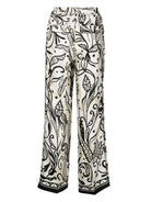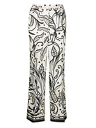 PALAZZO SILK PYJAMA TROUSERS FROM F.R.S FOR RESTLESS SLEEPERS FEATURING WHITE/BLACK, SILK, ALL-OVER FLORAL PRINT, ELASTICATED WAISTBAND, BUTTON FASTENING AND PALAZZO DESIGN.