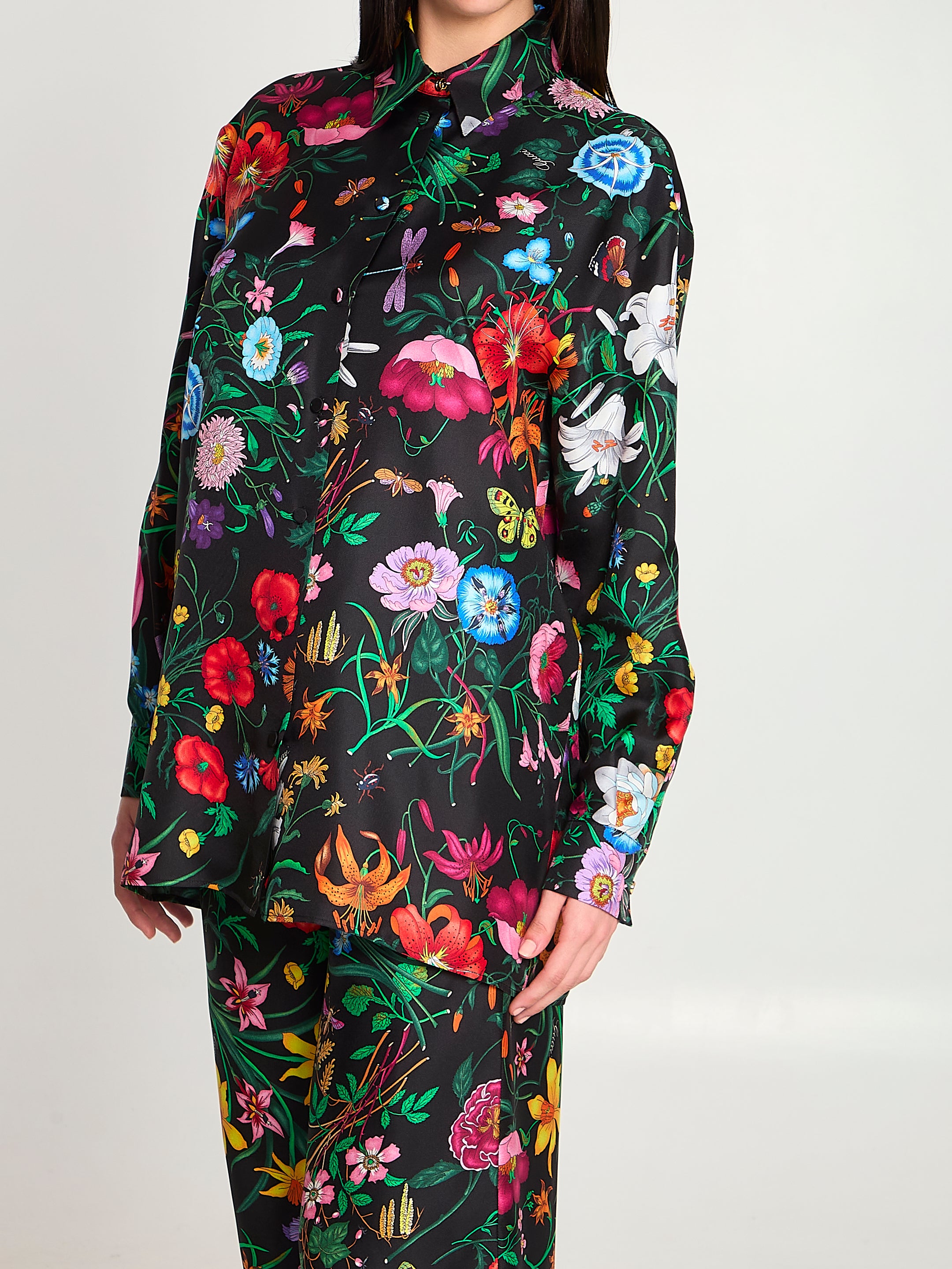 Black silk twill shirt with an all-over multicolor Gucci Flora print. Features a point collar, front button closure with covered buttons and metal GG button detail, long sleeves, metal GG button cuffs. Relaxed fit.