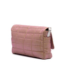 This shoulder bag features a quilted nylon body, a chain shoulder strap, a front flap with twist lock closure, and an interior slip pocket.