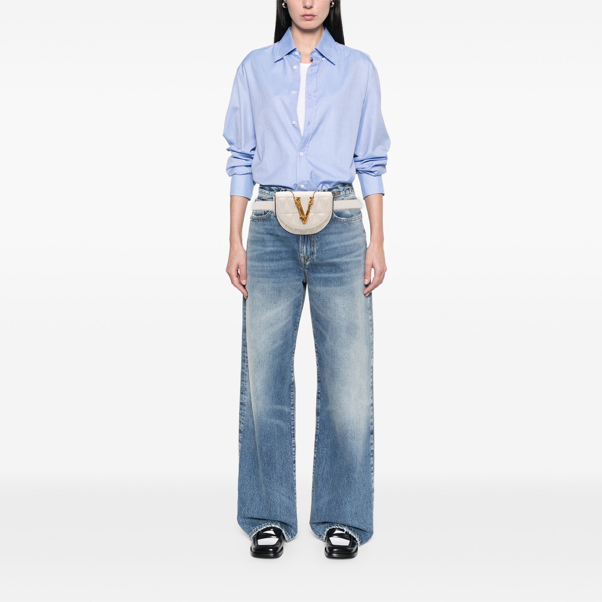 Elevate your everyday style with this exquisite Versace Quilted Nappa Virtus V Crossbody Belt Bag. Crafted from luxurious quilted nappa leather, this versatile piece features the iconic Virtus V hardware that adds a signature touch of Italian glamour.