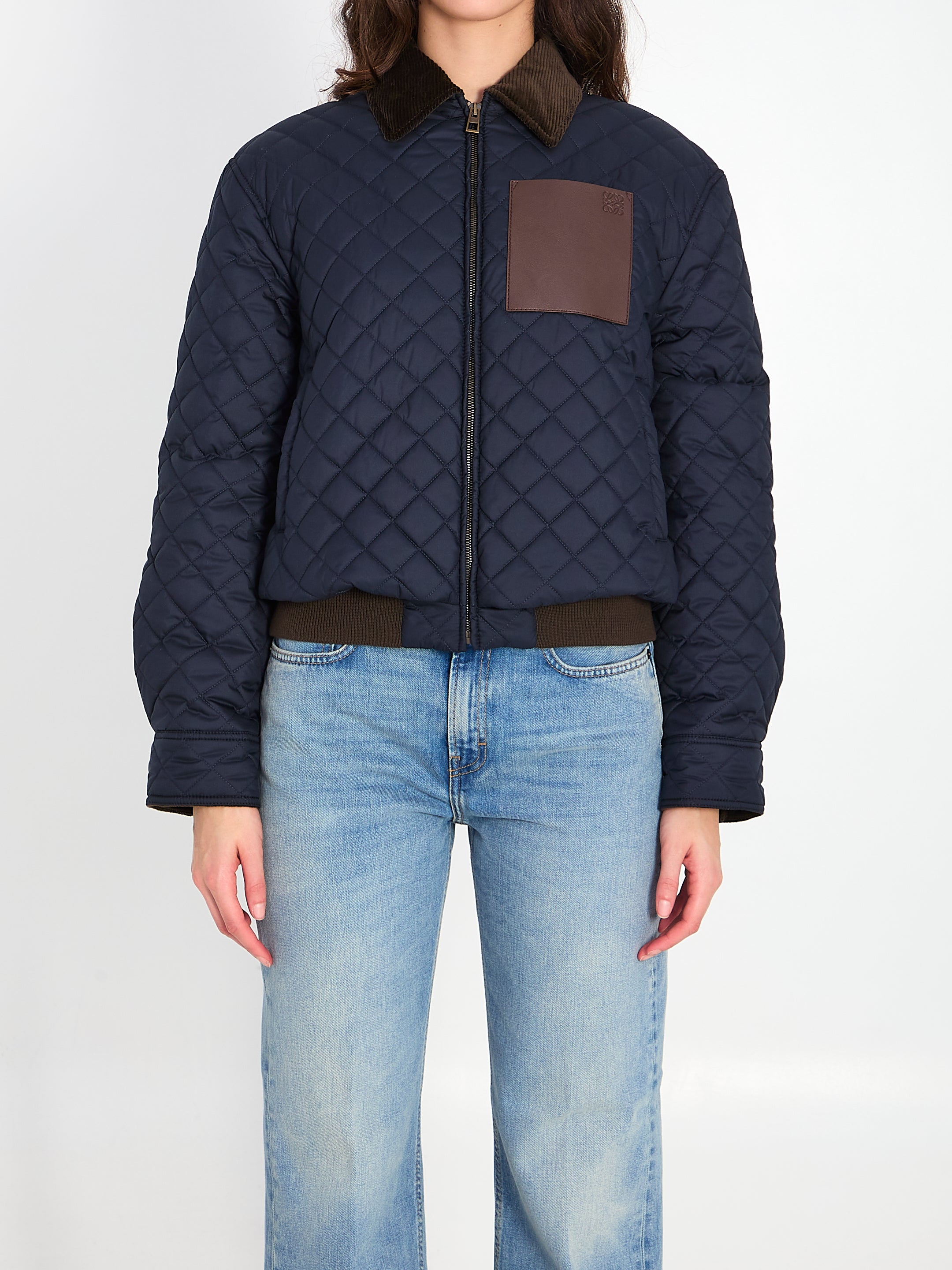 NAVY BLUE POLYESTER QUILTED JACKET. IT FEATURES A BROWN CORDUROY POINTED COLLAR, A FRONT ZIP CLOSURE, A BROWN LEATHER PATCH POCKET ON THE CHEST WITH A DEBOSSED ANAGRAM, TWO SIDE POCKETS, LONG SLEEVES, BUTTON CUFFS, A RIBBED HEM, AND POLYESTER PADDING. CROPPED CUT. REGULAR FIT. ANY IRREGULARITIES IN THE LEATHER ARE NOT TO BE CONSIDERED DEFECTS, BUT DISTINCTIVE FEATURES THAT HIGHLIGHT THE NATURAL QUALITY OF THE MATERIAL.
