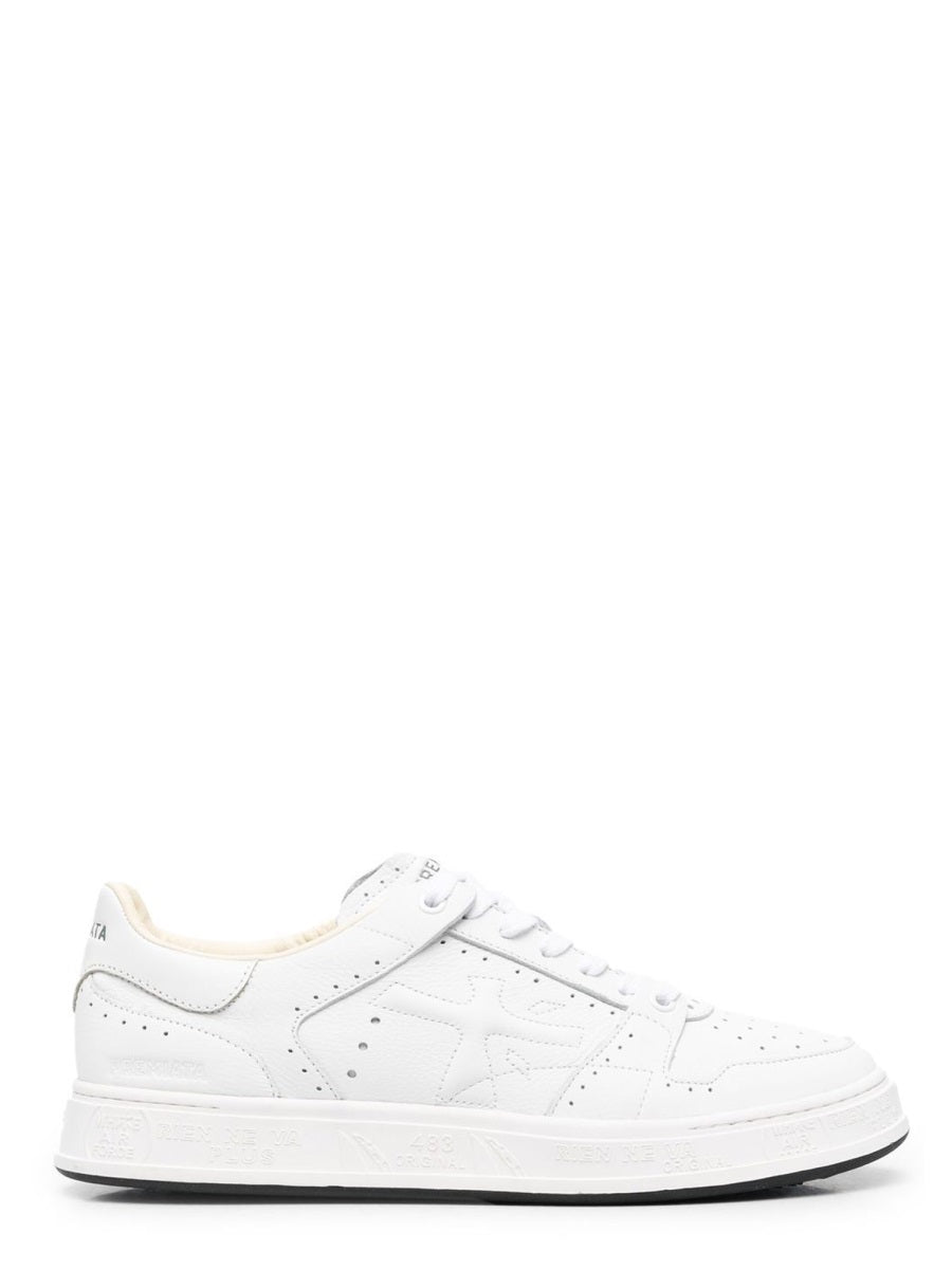 Elevate your everyday style with the Quinn 7322 Sneakers from Premiata. These pristine white leather sneakers feature a sleek low-top silhouette with subtle perforated detailing and a convenient velcro strap for a modern, sporty aesthetic.