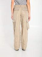 Beige Radzimir silk cargo trousers. They feature an adjustable waist with a drawstring, a button and zip closure, two side pockets, two cargo flap pockets with buttons, two flap pockets on the back, twisted topstitching, a low waist, and a barrel leg. Wide fit.