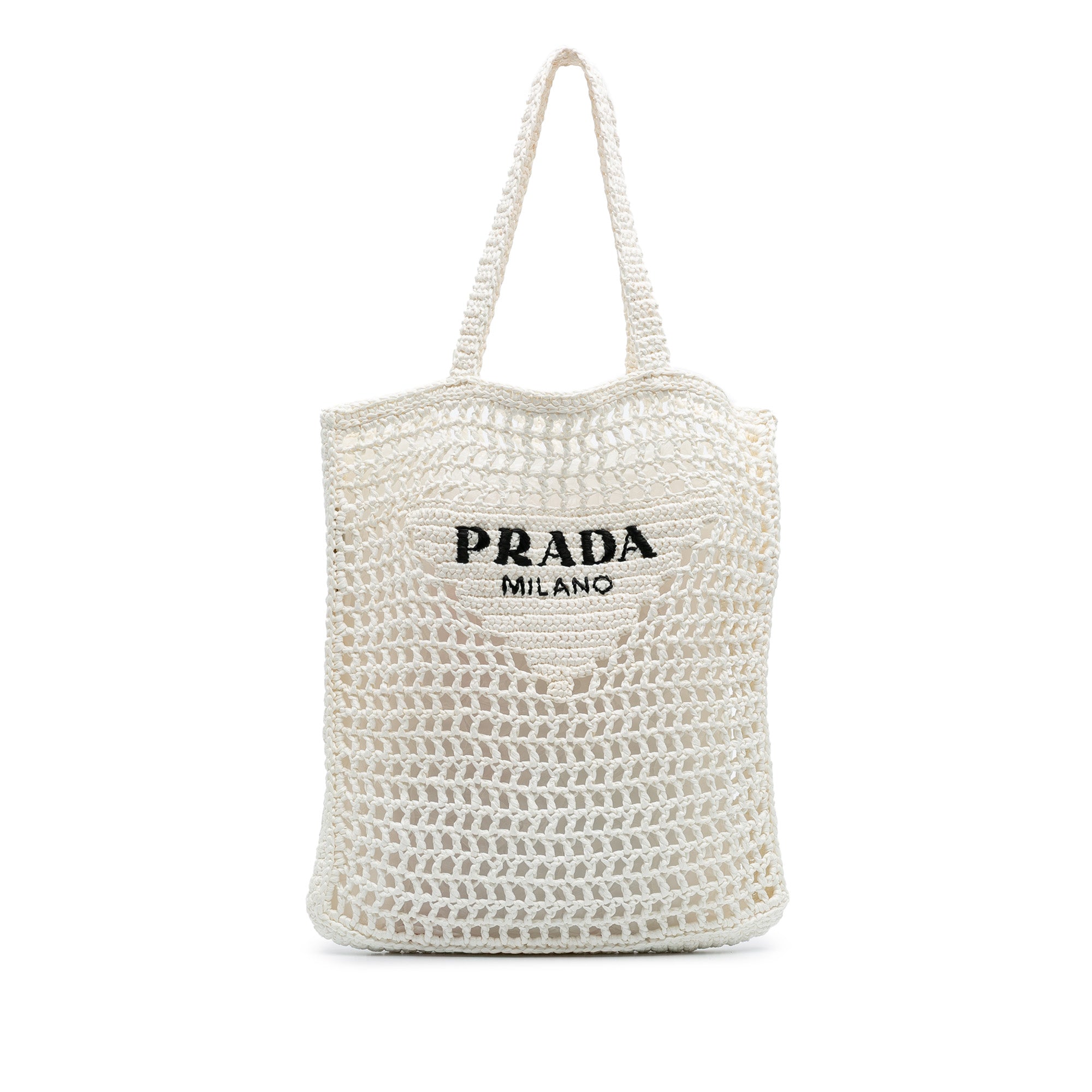 The iconic Prada logo is elegantly embroidered on the front, while the flat raffia handles provide comfortable carrying for all-day wear. The open-top design offers easy access to your essentials, making this tote ideal for beach getaways, weekend markets, or casual city strolls.