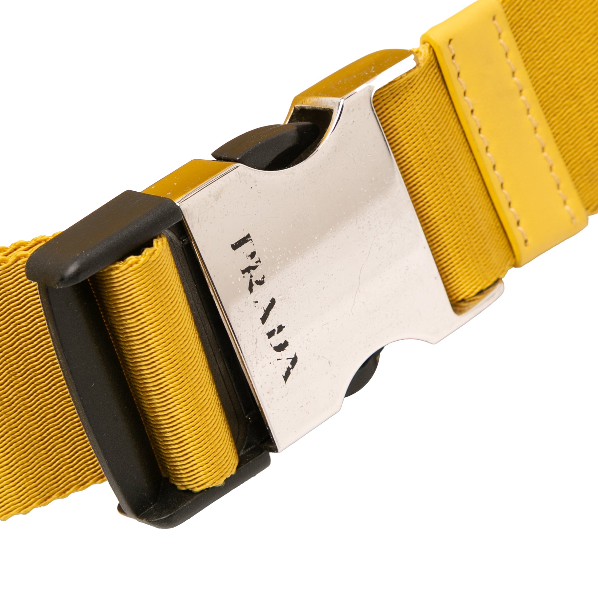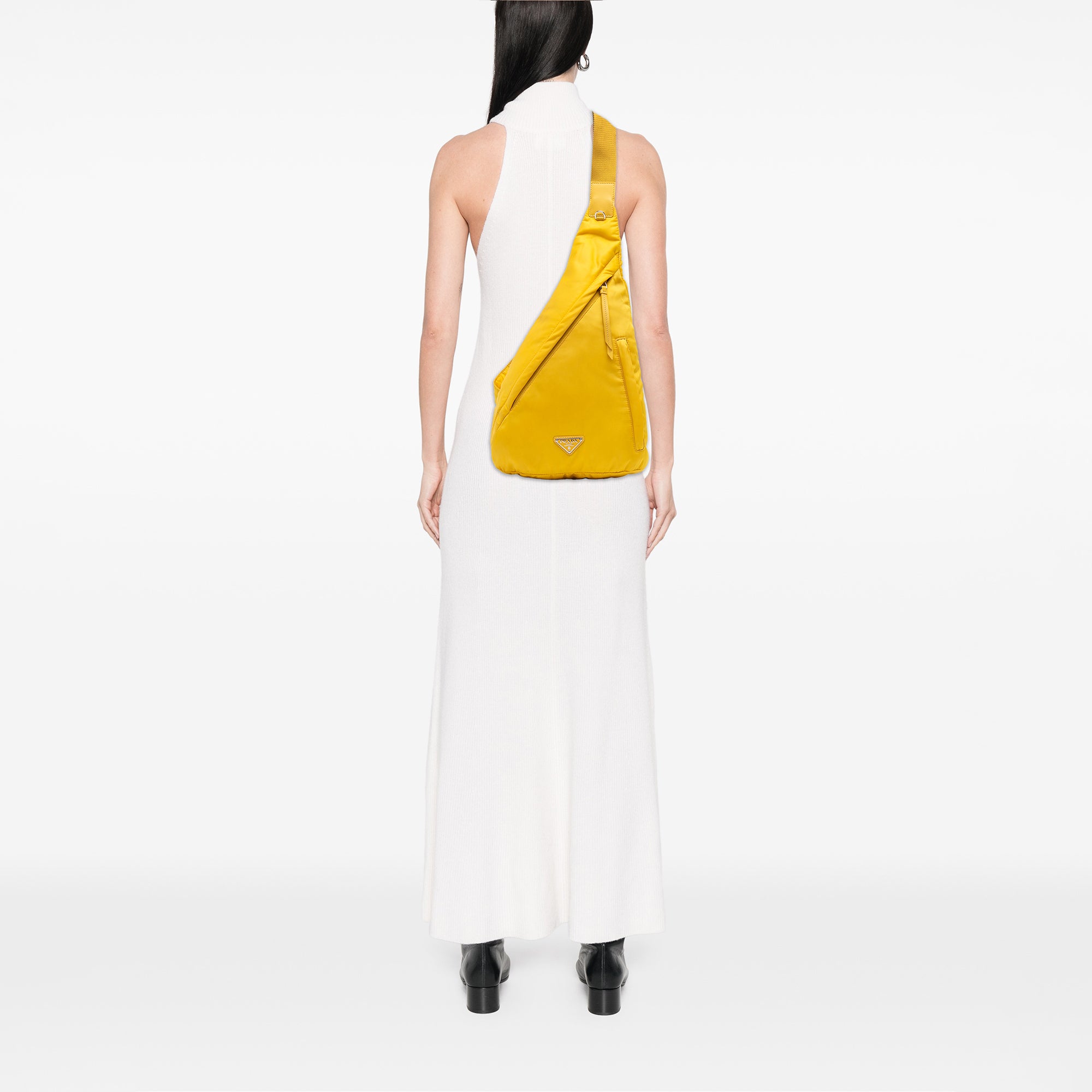 This sling bag features a nylon body, an adjustable flat back strap with buckle closure, a front zip closure, exterior front and back zip pockets, and an interior zip pocket.