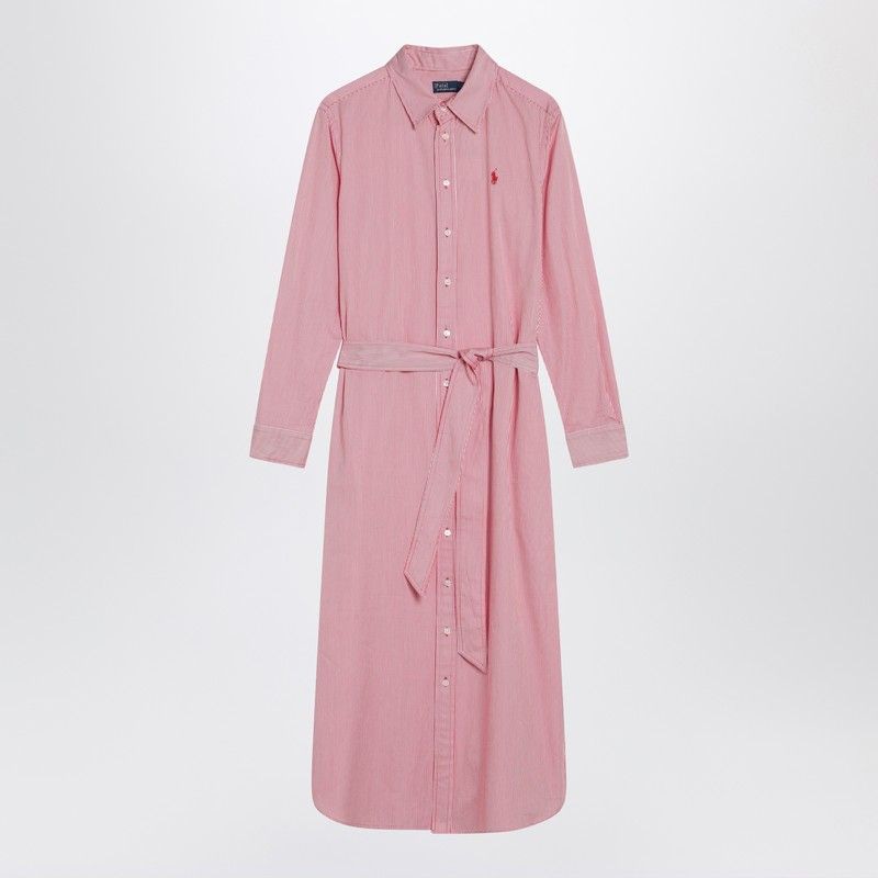 Elevate your everyday wardrobe with this classic midi shirt dress from Polo Ralph Lauren. Crafted in fine-striped white and red cotton, this versatile piece features a timeless shirt collar, long sleeves with buttoned cuffs, and a flattering matching tie belt at the waist.
