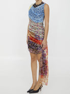 Regenerated Scarves short dress crafted from regenerated silk with patchwork design. Side zip closure and hook closure at the back of the neck. All-over drapes and asymmetric hem. Slim fit.