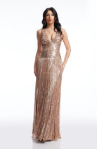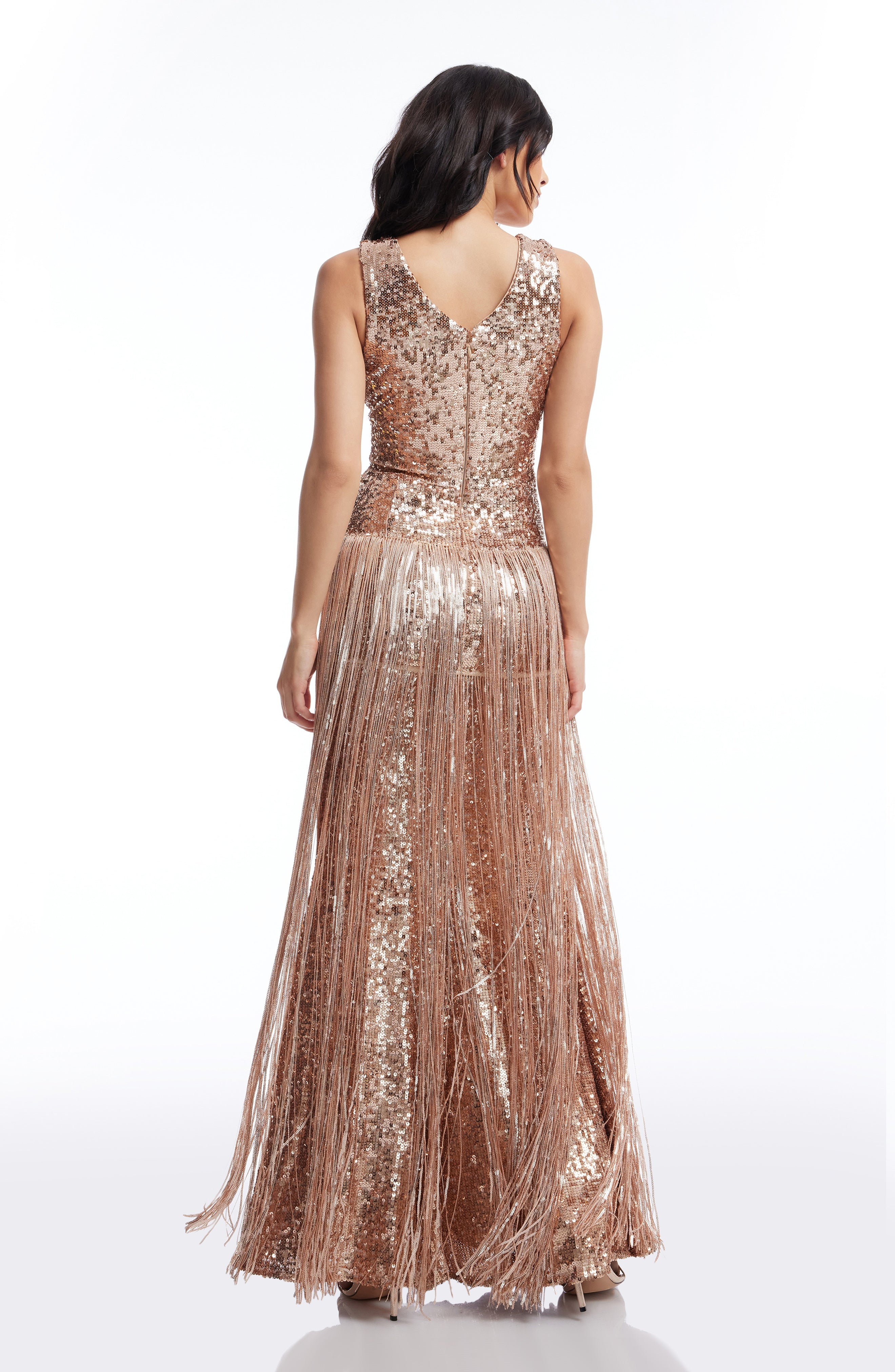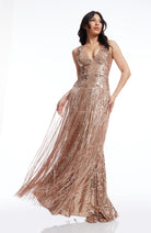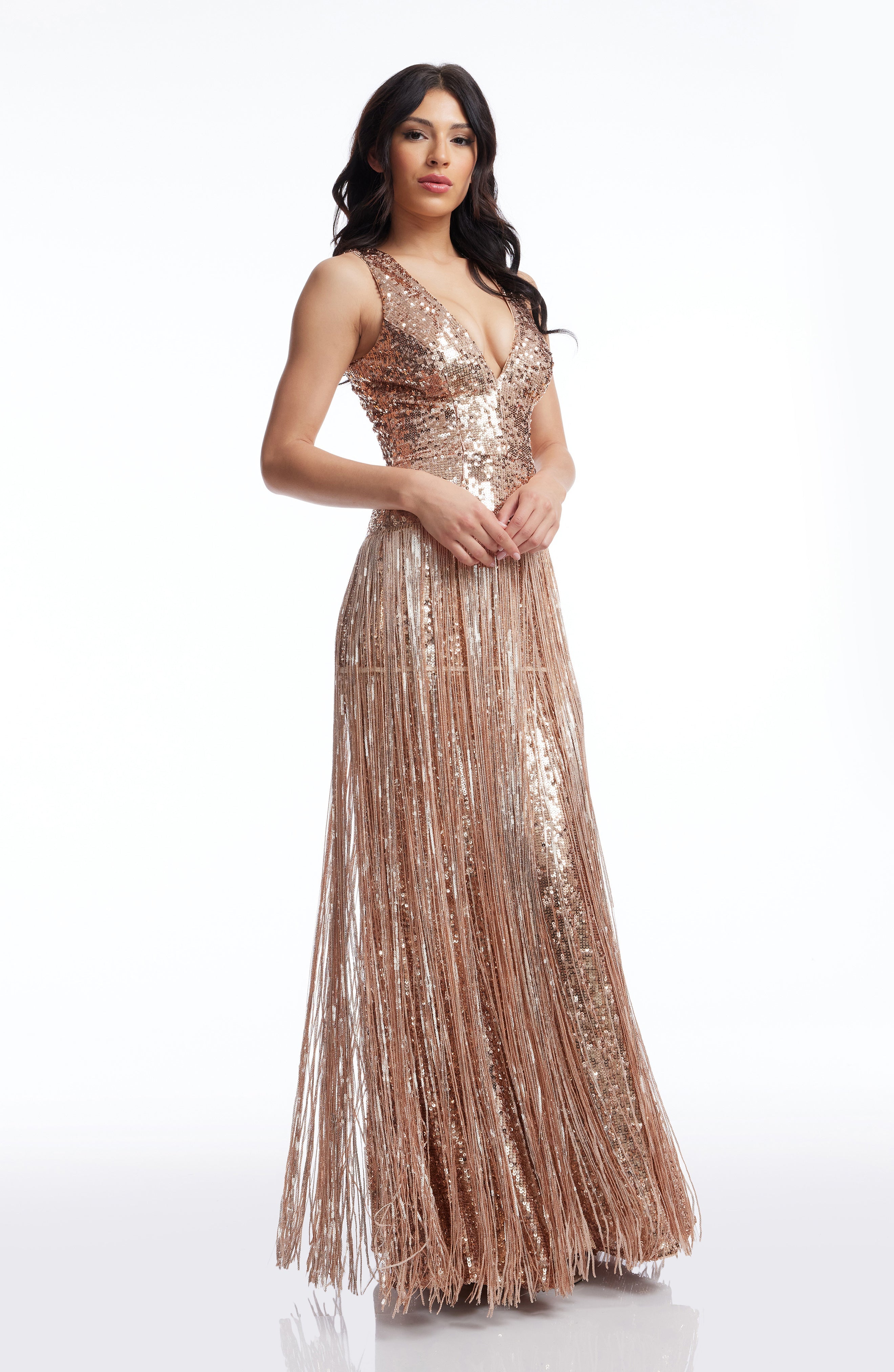 The Reign Dress is a stunning blend of modern and classic design. The sleeveless deep v-neck highlights the neckline while the bodycon silhouette accentuates your curves. The mermaid gown adds a touch of elegance while the fringe detailing adds a playful element. Perfect for any formal occasion.