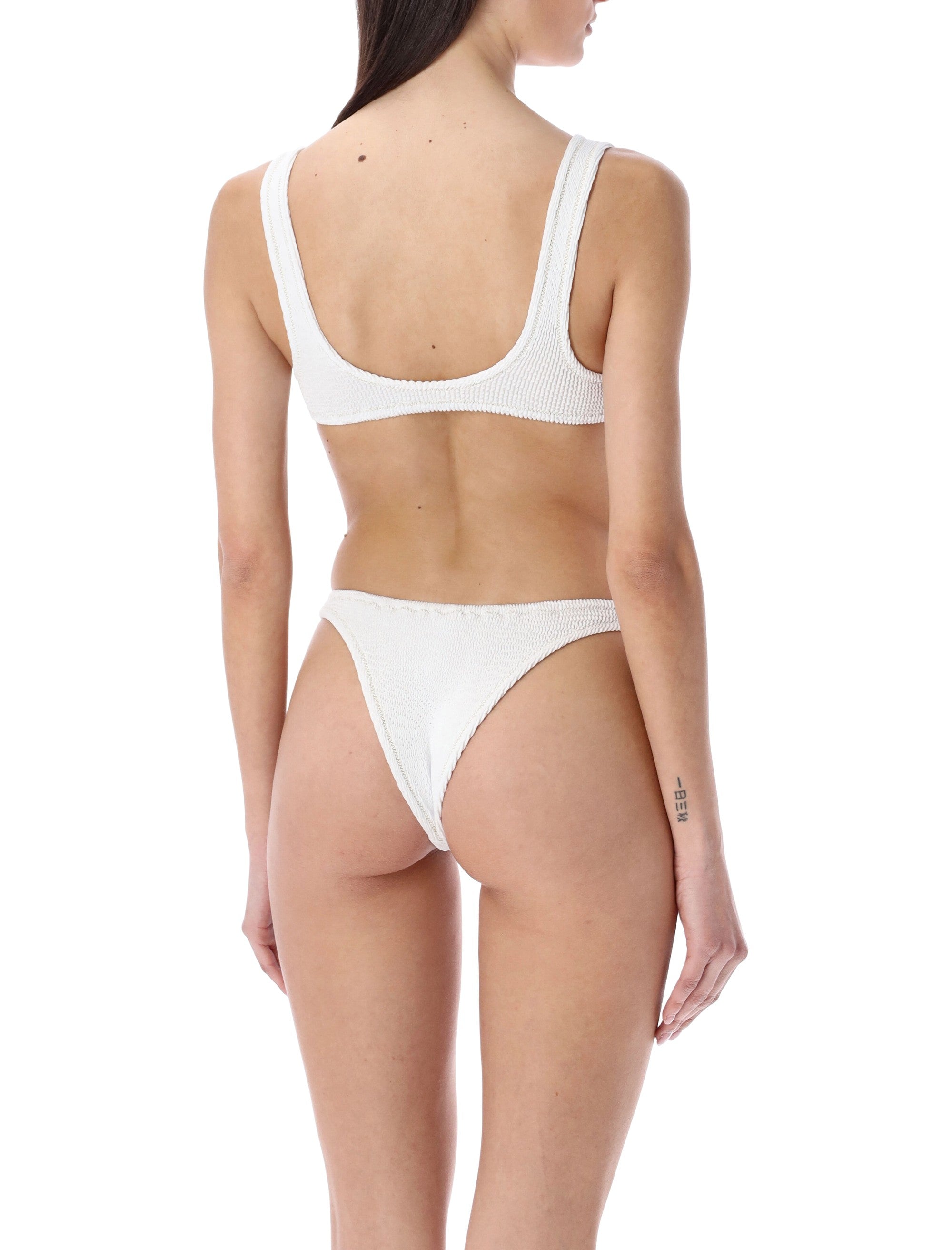 SCULPTURAL AND MODERN, THE REINA OLGA AUGUSTA SWIMSUIT COMBINES A SCOOP NECKLINE WITH STRETCHY CRINKLE FABRIC FOR COMFORT AND STYLE. FEATURING CUT-OUTS ON THE BACK AND SIDES, A FRONT RING DETAIL, AND GOLD-TONE STITCHING, IT CREATES A BOLD YET ELEGANT SILHOUETTE, PERFECT FOR A STATEMENT BEACH LOOK.
