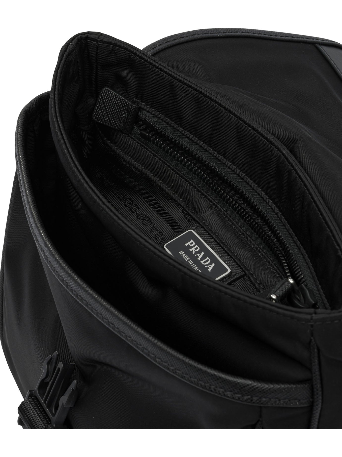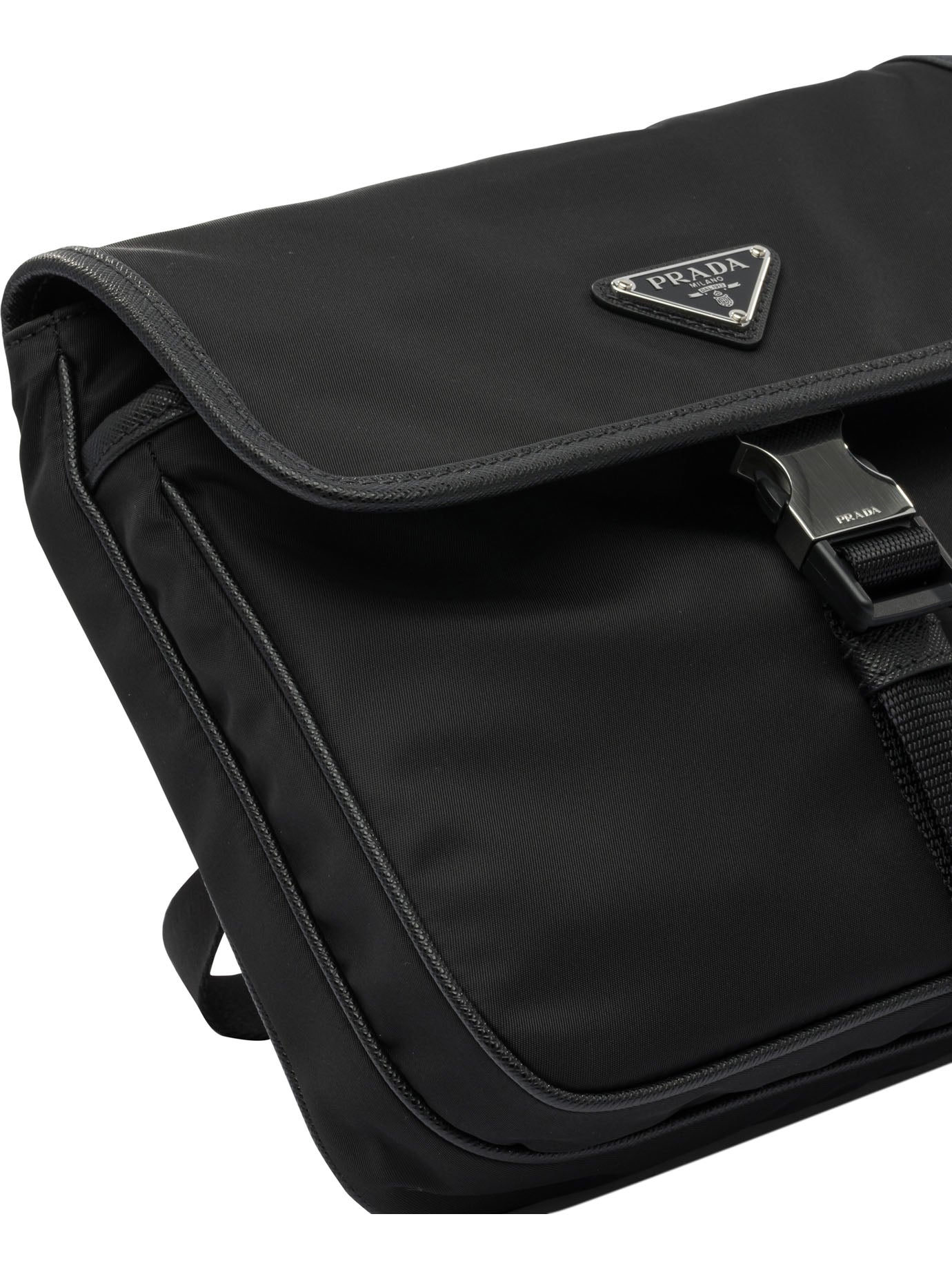 Prada's Re-Nylon and saffiano crossbody bag, made with textured panels of saffiano leather and recycled Re-Nylon. The compact silhouette integrates an adjustable ribbon and leather shoulder strap with a maximum length of 140 cm. The design is complemented by a front flap with a snap closure system, enameled metal triangle logo and functional details inspired by sporty aesthetics. The interior construction includes an initialed Re-Nylon lining.