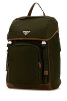 Elevate your everyday carry with this sophisticated RE-NYLON AND SUEDE BACKPACK from Prada. Crafted from durable polyamide re-nylon with luxurious suede and leather accents, this backpack seamlessly blends functionality with high-fashion aesthetics. The rich olive green colorway is complemented by warm brown leather trim, creating a timeless and versatile piece that transitions effortlessly from work to weekend. Featuring a spacious main compartment with zip closure and a convenient front pocket, this backpack offers ample storage for all your essentials. The adjustable straps ensure comfortable wear, while the iconic Prada triangle logo adds an unmistakable touch of luxury. Whether you're navigating the city streets or embarking on a travel adventure, this refined backpack is the perfect companion for the modern, style-conscious individual.
