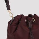 The rich burgundy hue and iconic triangular logo hardware make this pouch a sophisticated statement piece. Perfect for organizing your must-haves or carrying as a chic wristlet for evening outings, this compact design seamlessly transitions from day to night.