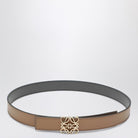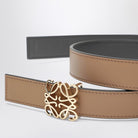 Elevate your everyday style with this exquisite LOEWE Reversible Anagram Belt in sophisticated beige and asphalt gray. Crafted from luxurious grained calfskin, this versatile accessory features the iconic gold-tone metal Anagram buckle that serves as a signature statement of refined elegance.