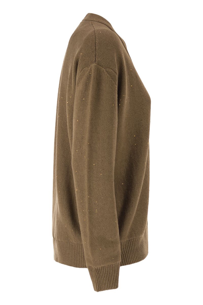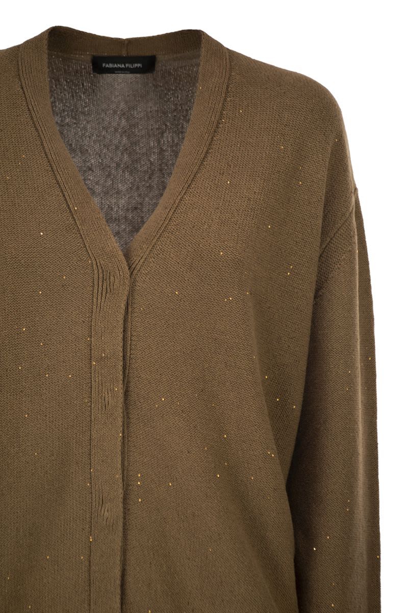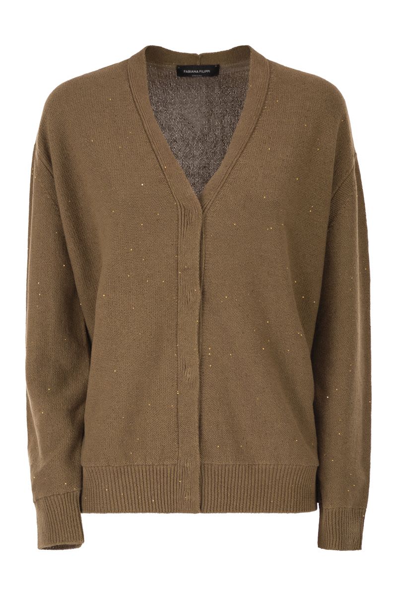 THIS REVERSIBLE CARDIGAN EMBODIES FABIANA FILIPPI'S REFINED VERSATILITY, OFFERING TWO DISTINCT LOOKS IN A SINGLE GARMENT OF HIGH ITALIAN CRAFTSMANSHIP. MADE FROM AN ICONIC, LIGHTWEIGHT COTTON AND LINEN YARN, THE MAIN SIDE IS DELICATELY ILLUMINATED BY MICRO SEQUINS FOR A SOPHISTICATED SHINE. THE REVERSE SIDE REVEALS AN ETHEREAL SOUL THANKS TO THE OVERLAY OF A TECHNICAL TULLE VEIL THAT CREATES REFINED TRANSPARENCIES. ENTIRELY PRODUCED IN ITALY USING SUSTAINABLE PROCESSES, IT FEATURES A CLASSIC BUTTON CLOSURE AND RIBBED TRIM. - REVERSIBLE DESIGN - ICONIC LIGHTWEIGHT COTTON AND LINEN YARN - SURFACE ILLUMINATED BY MICRO SEQUINS - LIGHTWEIGHT TULLE LAYER ON THE REVERSE SIDE - DEEP V-NECK - FRONT CLOSURE WITH TONE-ON-TONE BUTTONS - RIBBED EDGES AND CUFFS - MADE IN ITALY USING SUSTAINABLE PROCESSES DESIGNER ID: MAD266F095L926 1268