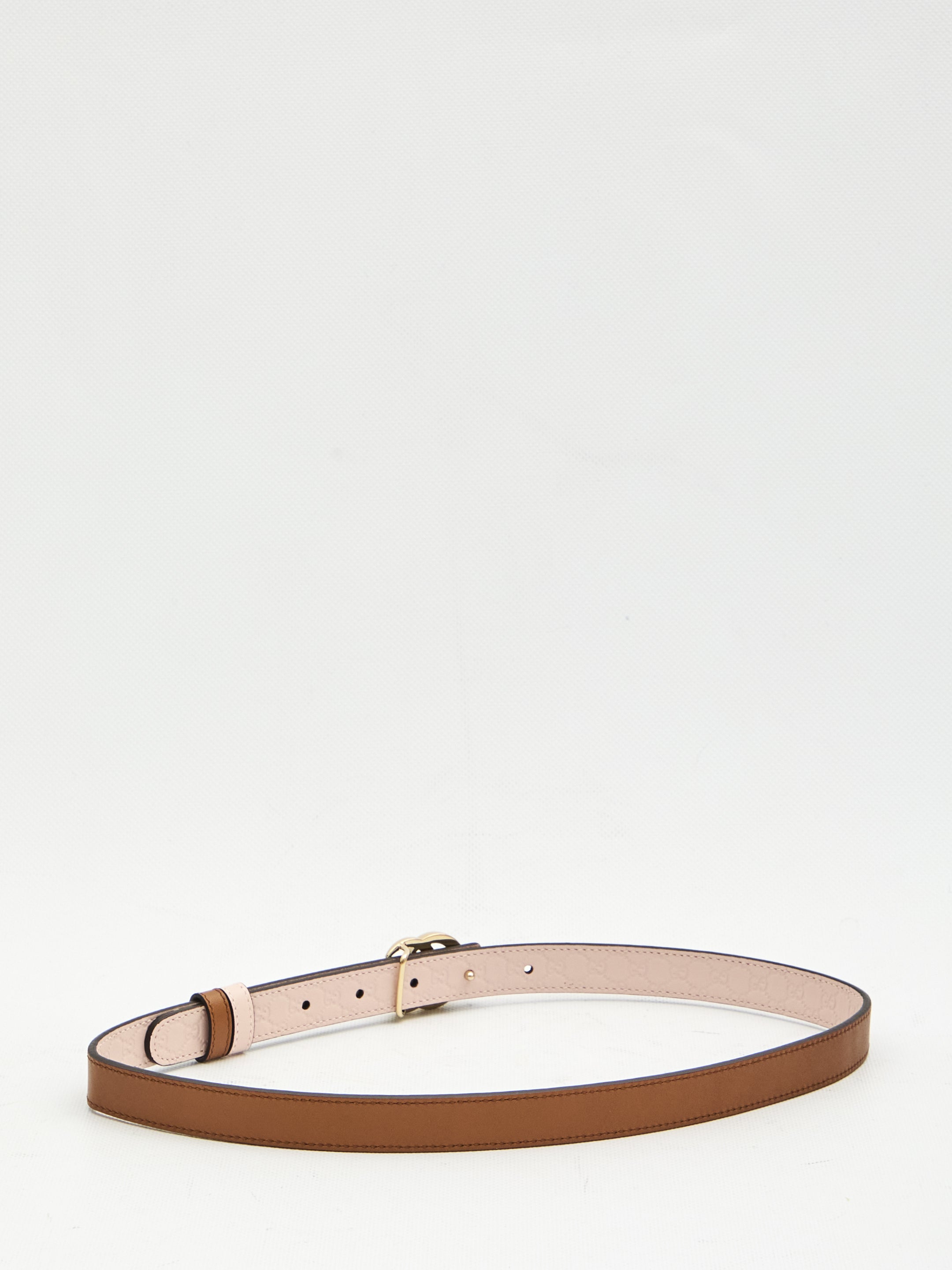 REVERSIBLE PINK GG SUPREME BELT ON ONE SIDE AND BROWN LEATHER ON THE OTHER. IT FEATURES A LIGHT GOLD-TONE DOUBLE G BUCKLE. ANY IMPERFECTIONS IN THE LEATHER ARE NOT CONSIDERED MANUFACTURING DEFECTS, BUT A CHARACTERISTIC OF THE MATERIAL.