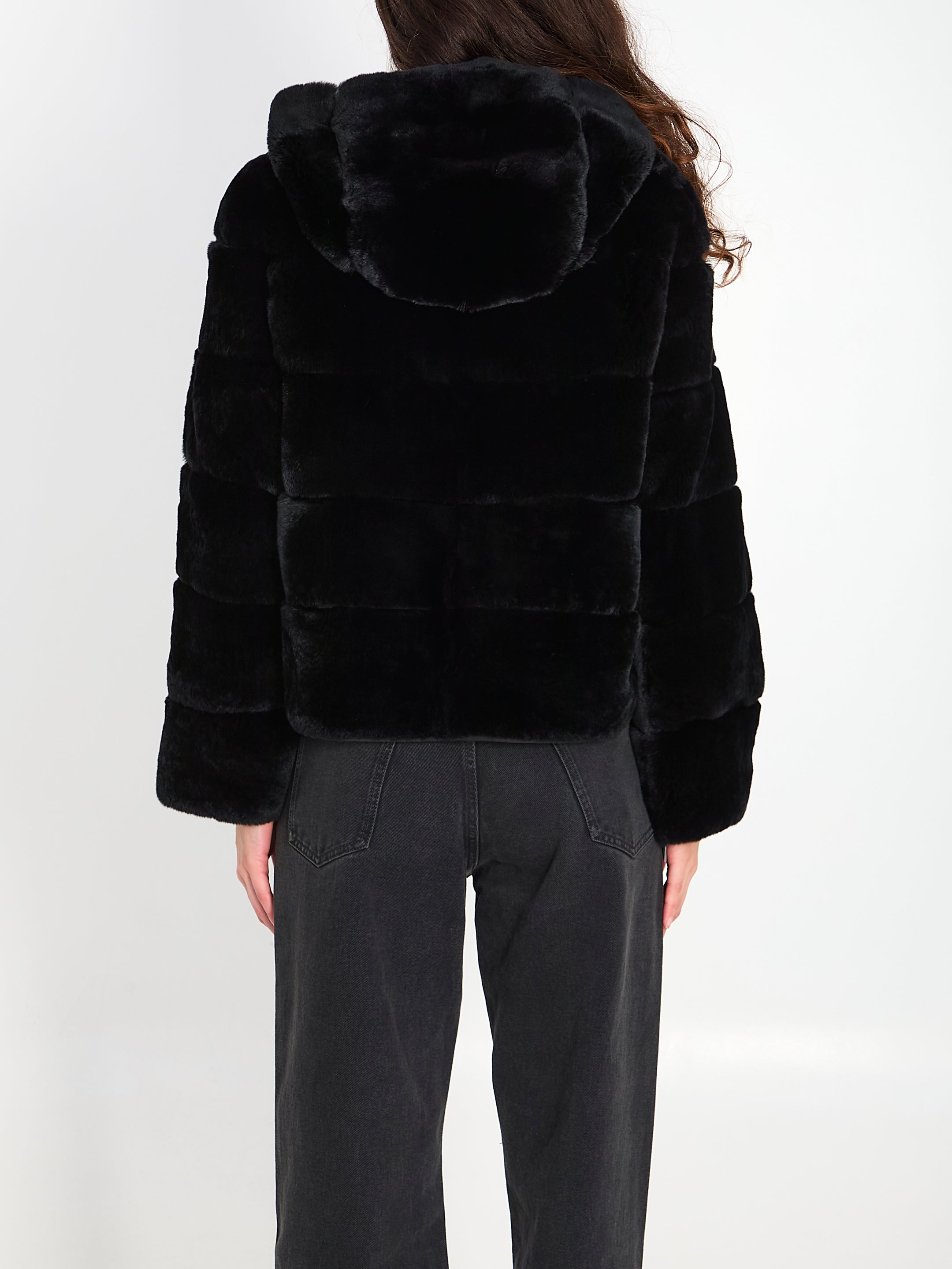 REVERSIBLE JACKET IN REX RABBIT FUR AND BLACK TECHNICAL FABRIC. IT FEATURES AN ADJUSTABLE HOOD WITH A DRAWSTRING, ONE SIDE IN STRIPED REX FUR WITH TWO FRONT POCKETS, THE OTHER SIDE IN WATER-REPELLENT TECHNICAL FABRIC WITH TWO FRONT POCKETS, AND A FRONT ZIP CLOSURE. REGULAR FIT.