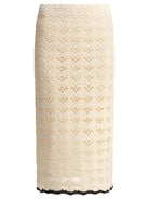 Zimmermann "Rhiannon" midi skirt made of crocheted knit fabric. It features a regular midi silhouette defined by a paneled construction with patterned details, scalloped hem and contrasting piping. The slip-on design is complemented by an elasticized waistband, designed for ease of wear and to maintain a snug fit at the waist. Seams follow a clean finish with no visible inserts.