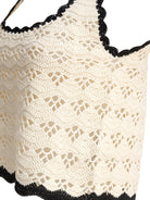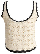 Zimmermann "Rhiannon" tank top features a cropped silhouette with crocheted knit construction. The sleeveless design features a linear construction and a deep round neckline. The hem, neckline and straps are finished with scalloped details and contrasting edges. The straps are fixed and non-adjustable, and the construction follows a continuous knit with no obvious seams.