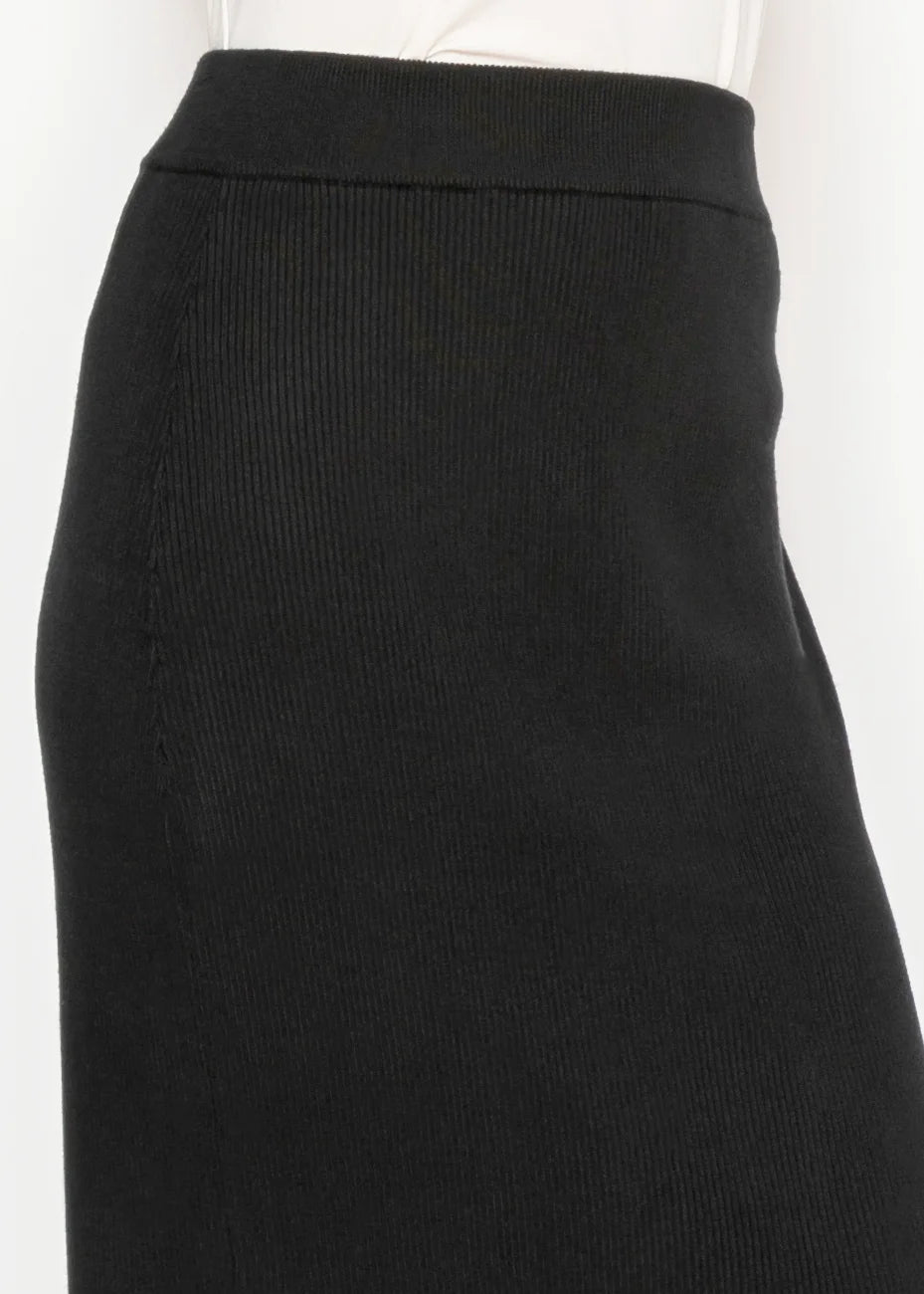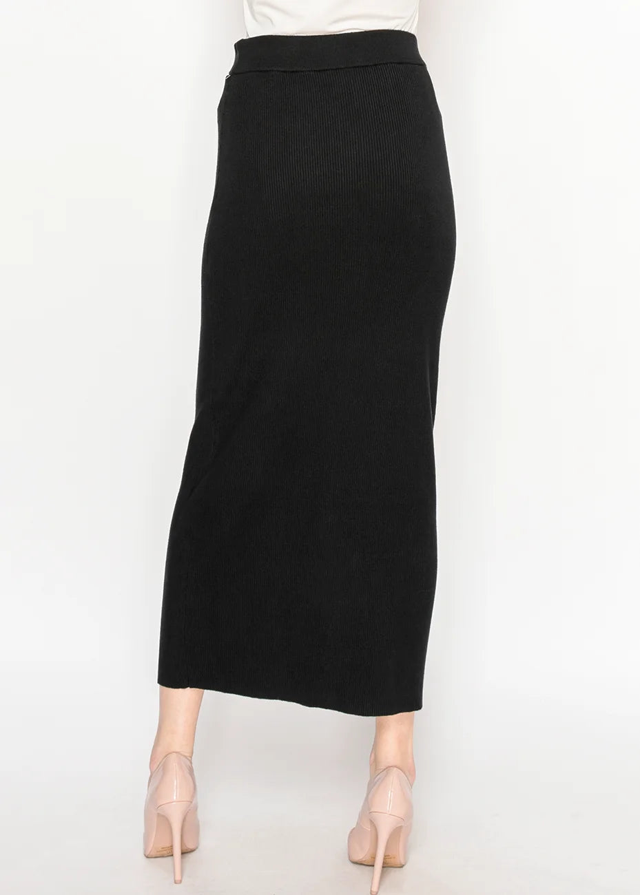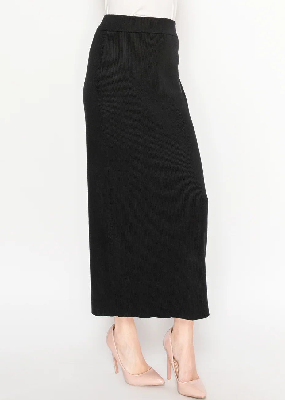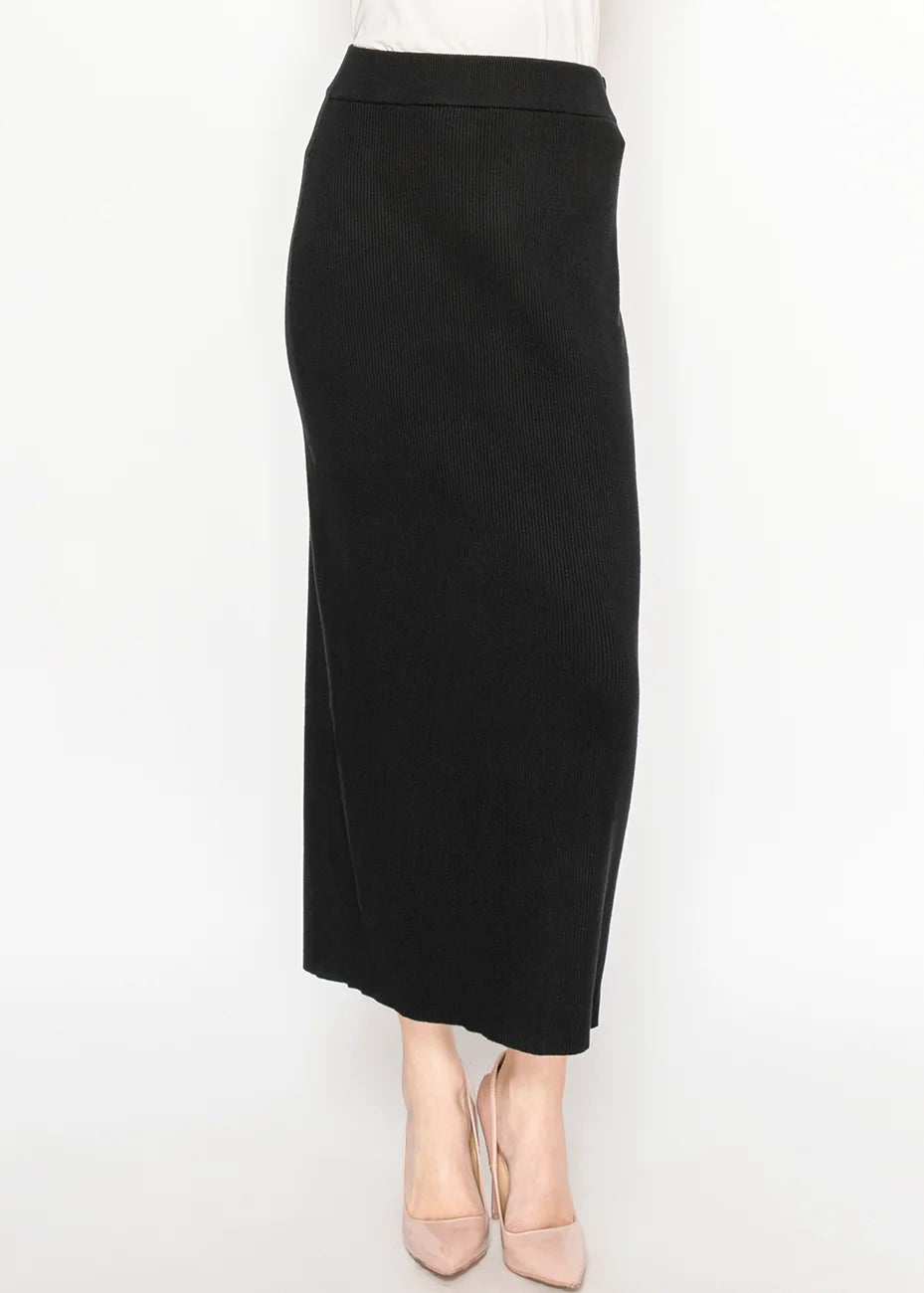 Streamlined and modest with a flattering fit, this ribbed black skirt is made to go with all your favorite fall sweaters and flats.