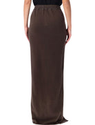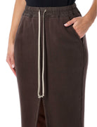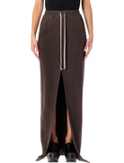 MINIMAL YET BOLD, THIS RICK OWENS DRKSHDW LONG SKIRT IS CRAFTED FROM SOFT BLACK COTTON JERSEY WITH AN ELASTICATED WAISTBAND AND CONTRASTING DRAWSTRINGS. DEFINED BY ITS FRONT SLIT AND ELONGATED SILHOUETTE, IT MERGES COMFORT WITH THE BRAND'S SIGNATURE AVANT-GARDE AESTHETIC.