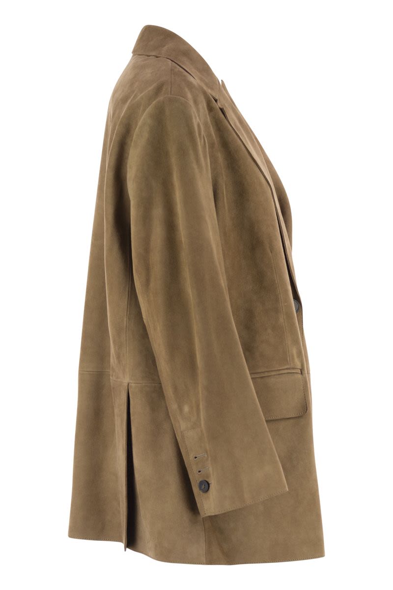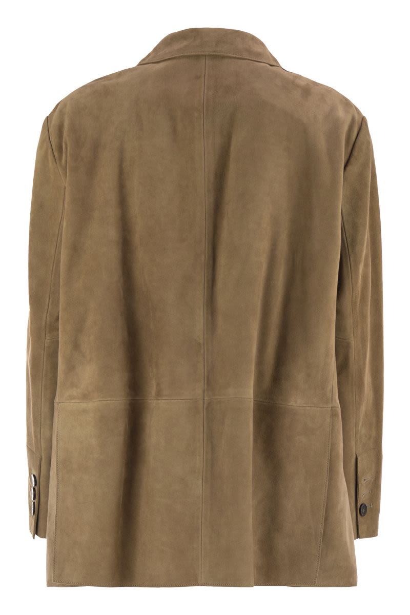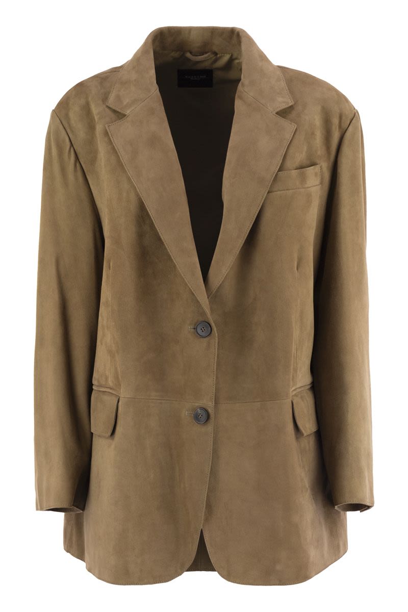SINGLE-BREASTED BLAZER IN SOFT SUEDE WITH OVERSIZE FIT AND SLIGHTLY DROPPED SHOULDER. - DEEP LAPEL COLLAR - LONG SLEEVES WITH BUTTONS ON THE BOTTOM - FRONT FASTENING WITH HORN-EFFECT BUTTONS - CHEST POCKET - PATCH FLAP POCKETS ON THE FRONT - LINED DESIGNER ID: 2525446071600 001