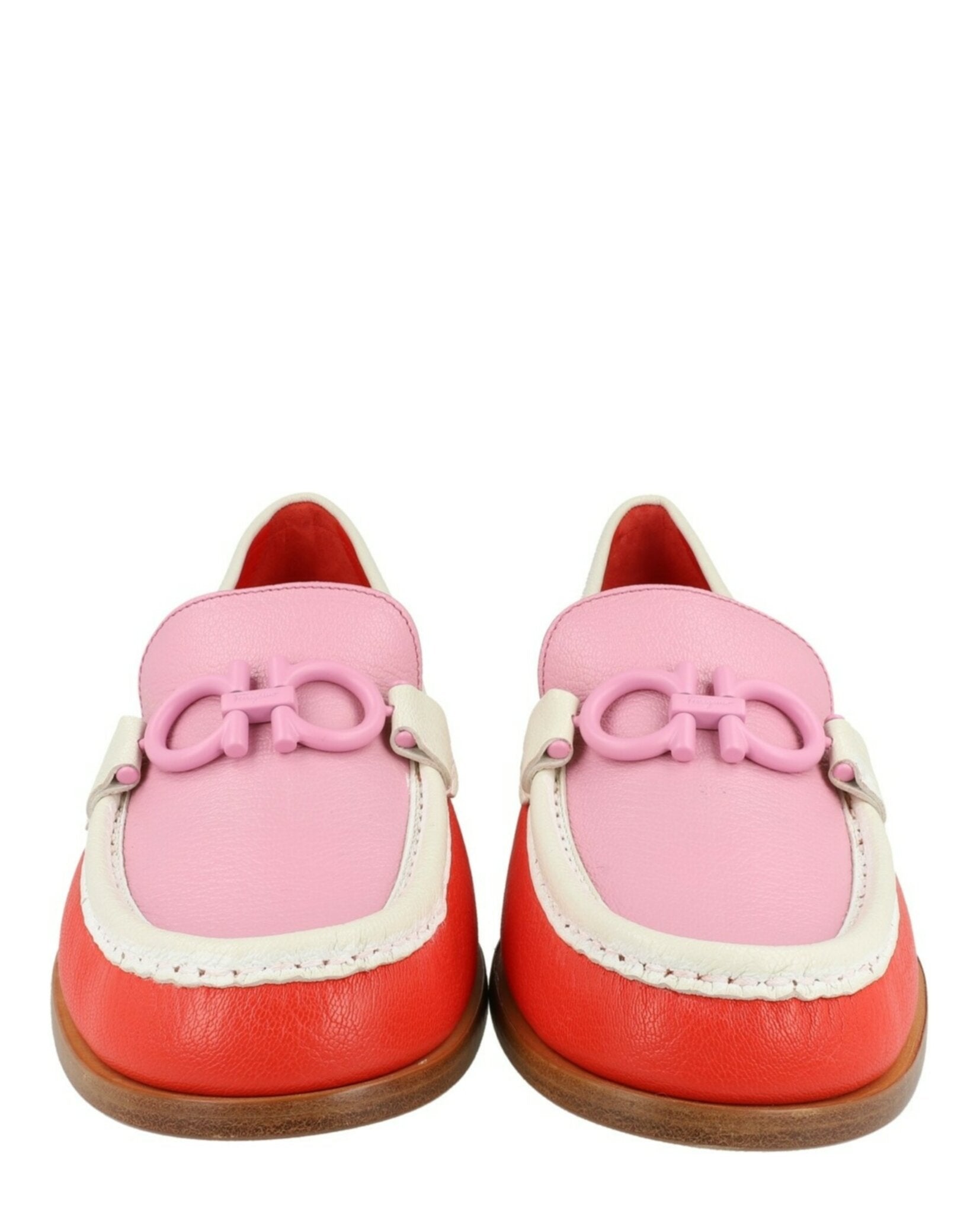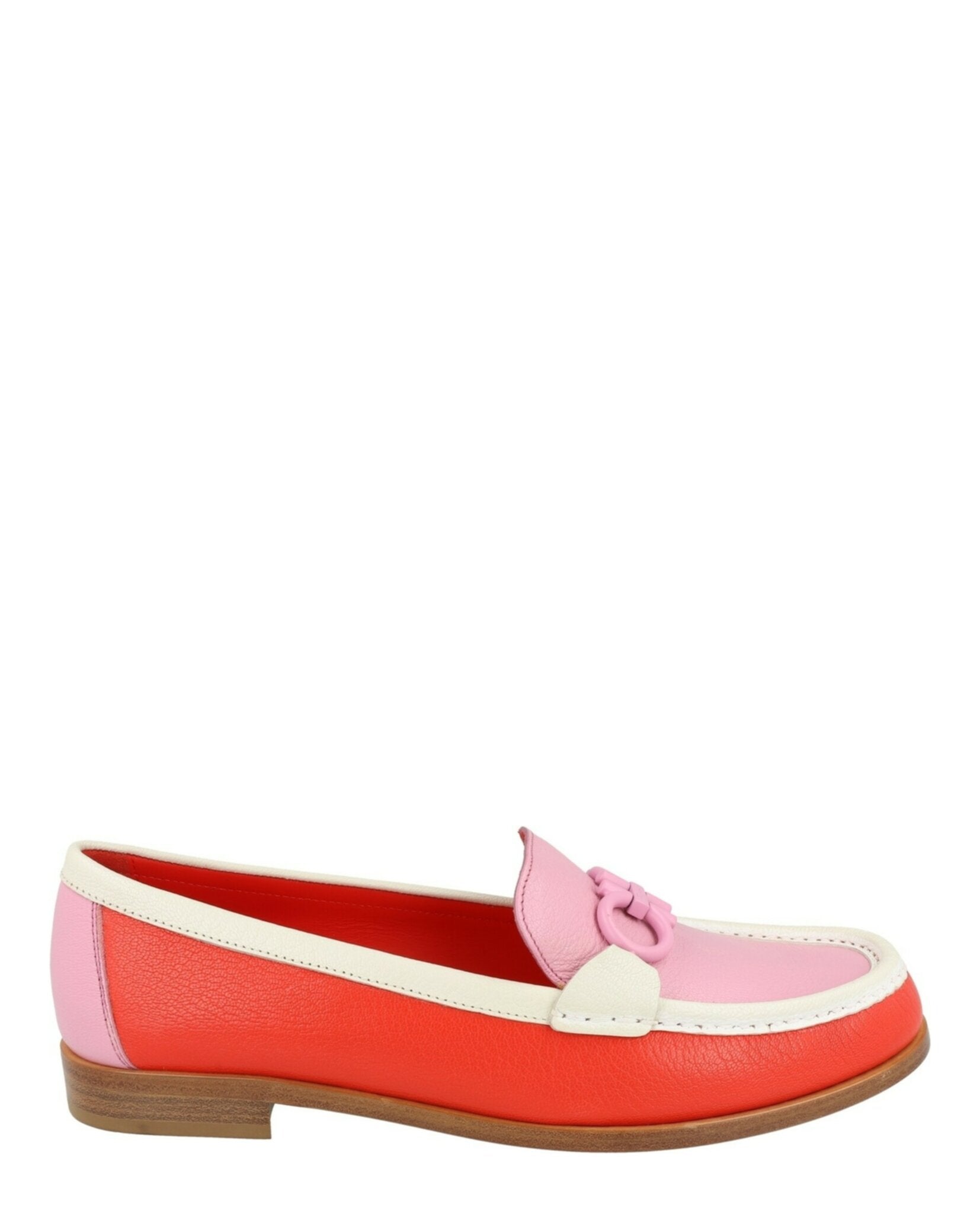 Step into effortless sophistication with the Rolo Gancini Leather Loafers from Ferragamo. These stunning loafers feature a playful colorblock design in pink, coral, and cream tones, crafted from luxurious goatskin leather with a pebbled finish.