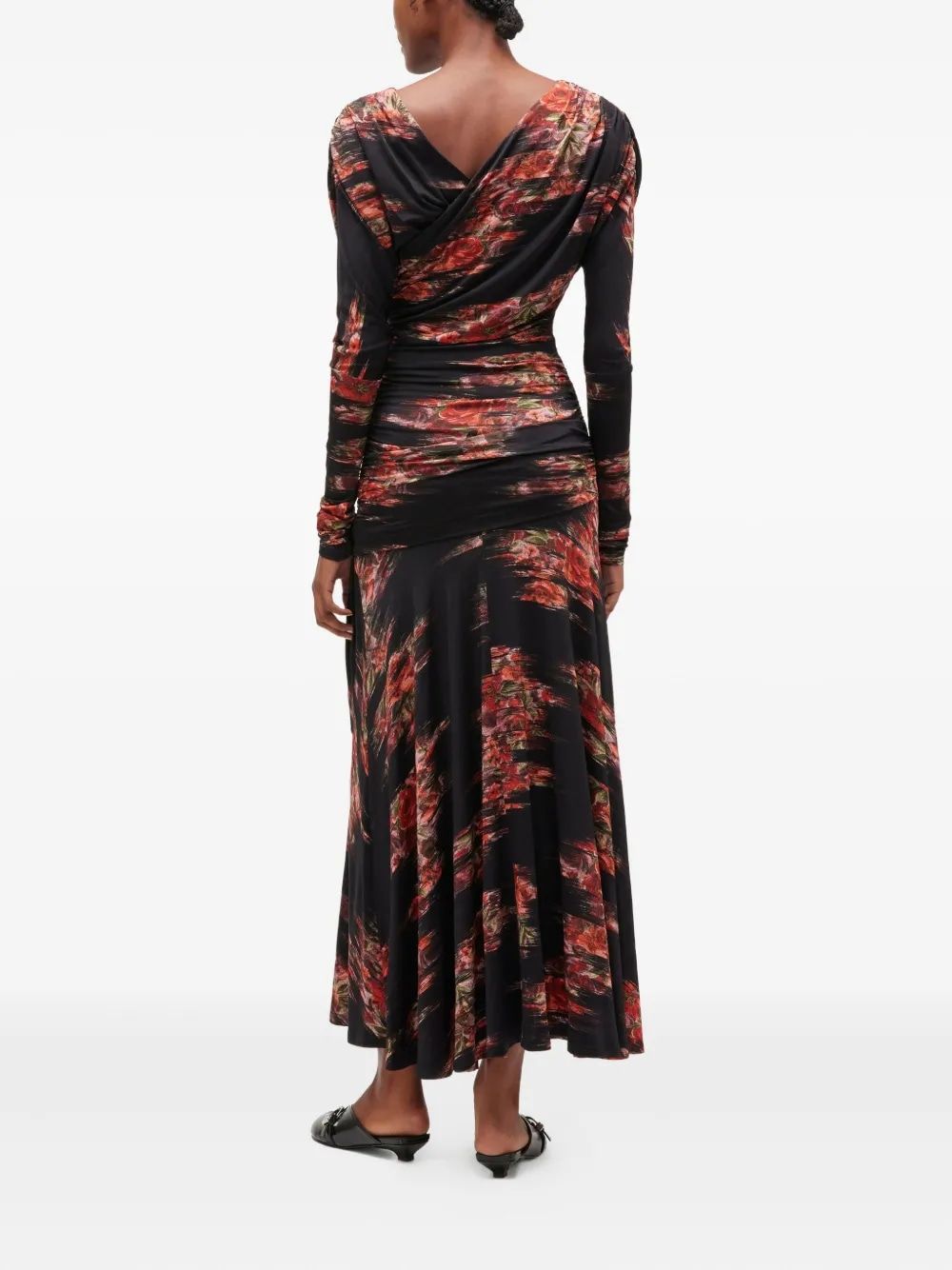 This stunning Ganni ruched dress features an elegant floral print in rich autumn tones against a sophisticated black base. The flattering V-neckline and long sleeves create a refined silhouette, while the ruched detailing adds texture and visual interest.