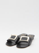 Black leather mules. They feature a square metal RV buckle at the front, a leather insole, and a suede leather sole. Dustbag included. Any imperfections in the leather should not be considered manufacturing defects but rather a characteristic of the material.