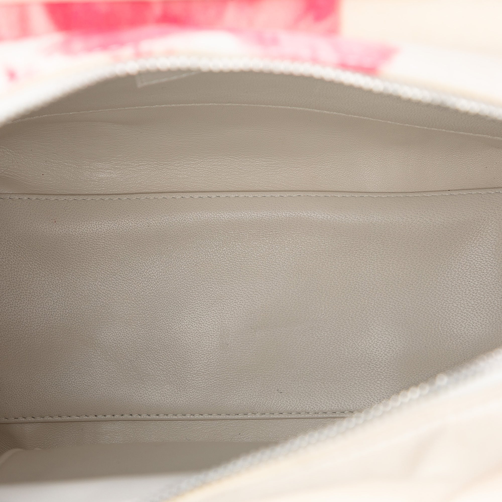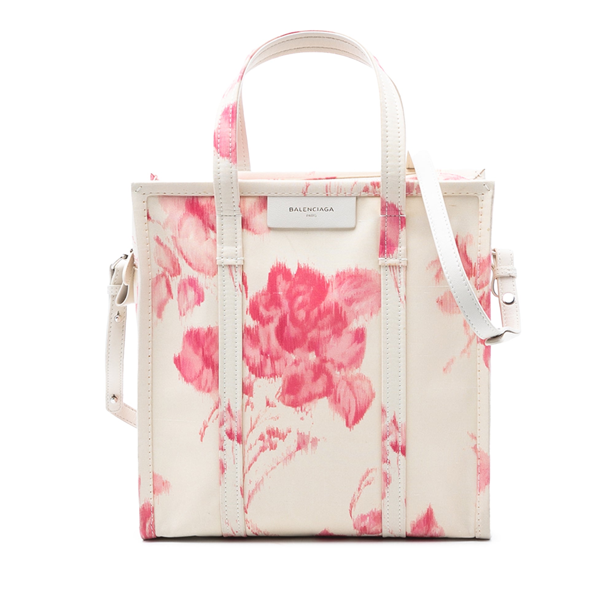 The Bazar Shopper features a silk with leather trim body, flat top handles, a detachable flat strap, a two-way top zip closure, and interior zip and slip pockets.
