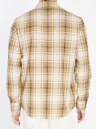 CELINE SABLE BEIGE COTTON LOOSE SHIRT. PURE COTTON SHIRT, POINTED COLLAR, FRONT BUTTONED FASTENING, CHEST PATCH POCKET, CHEST CONTRASTING GREY EMBROIDERED LOGO, LONG SLEEVES, BUTTONED CUFFS, ROUND HEM. WHITE, BEIGE AND BROWN CHECKED PATTERN ALL-OVER.