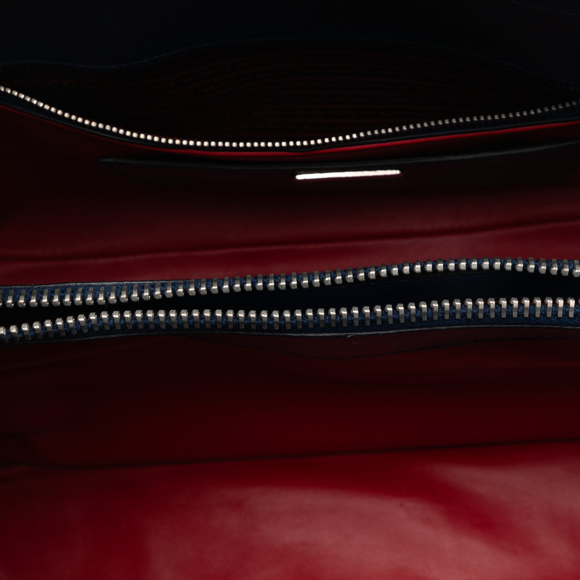 The Twin Tote features a leather body, rolled leather handles, top flaps with twin clasp closures, and an interior zip compartment, and an interior zip and slip pockets.