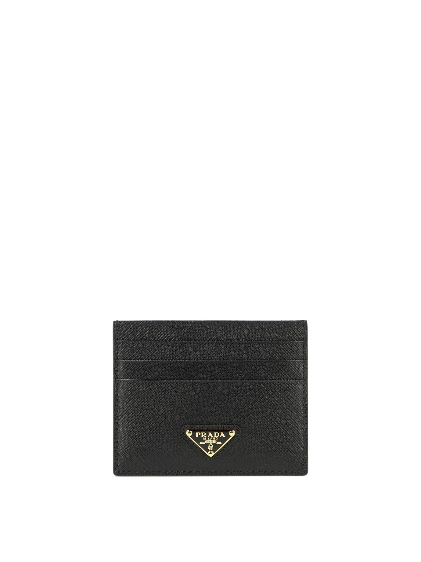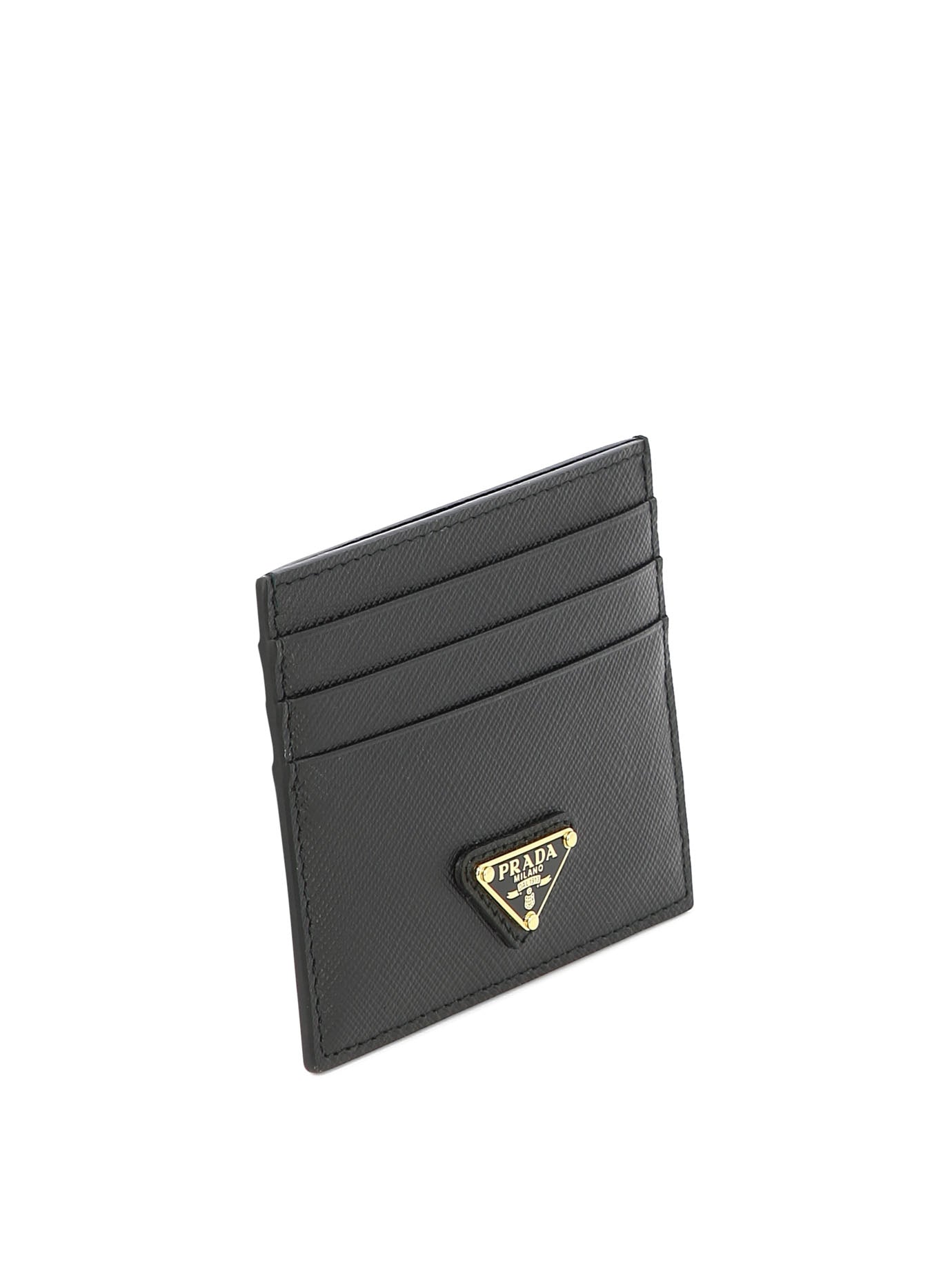 Prada Saffiano leather card holder made with micro-weave engraved texture. The compact structure features clean lines and raw-cut finished edges. Six card slots are integrated on both sides, complemented by a central interior pocket. The Prada logo on enameled metal triangle, applied on the surface, signals the brand's identity. The interior lining pairs moiré and Saffiano leather for added durability.