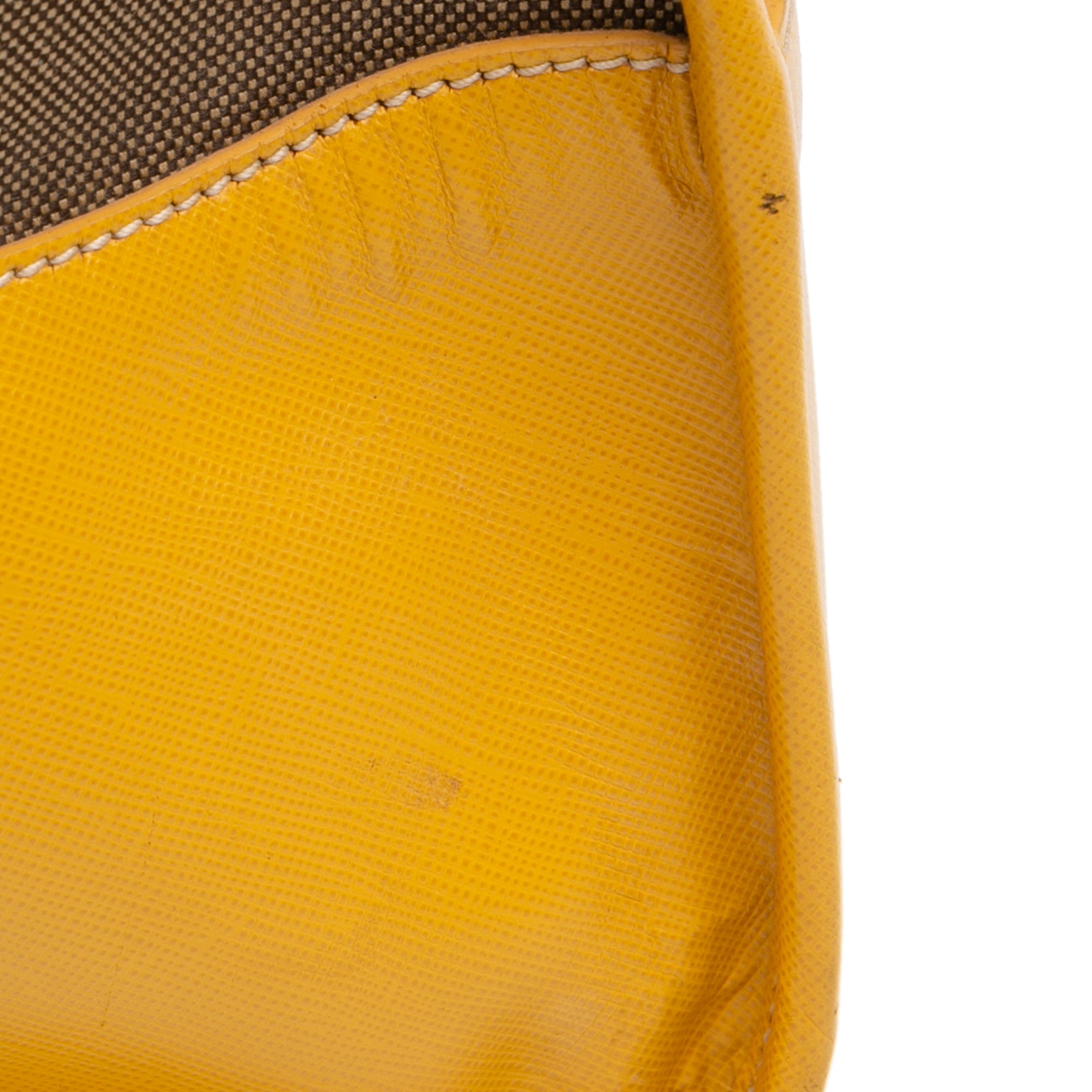 Elevate your everyday style with this sophisticated Prada Saffiano Trimmed Canvas Canapa Logo Satchel. This timeless piece features a durable canvas body beautifully accented with luxurious saffiano leather trim, combining practicality with high-fashion elegance.