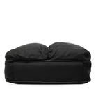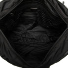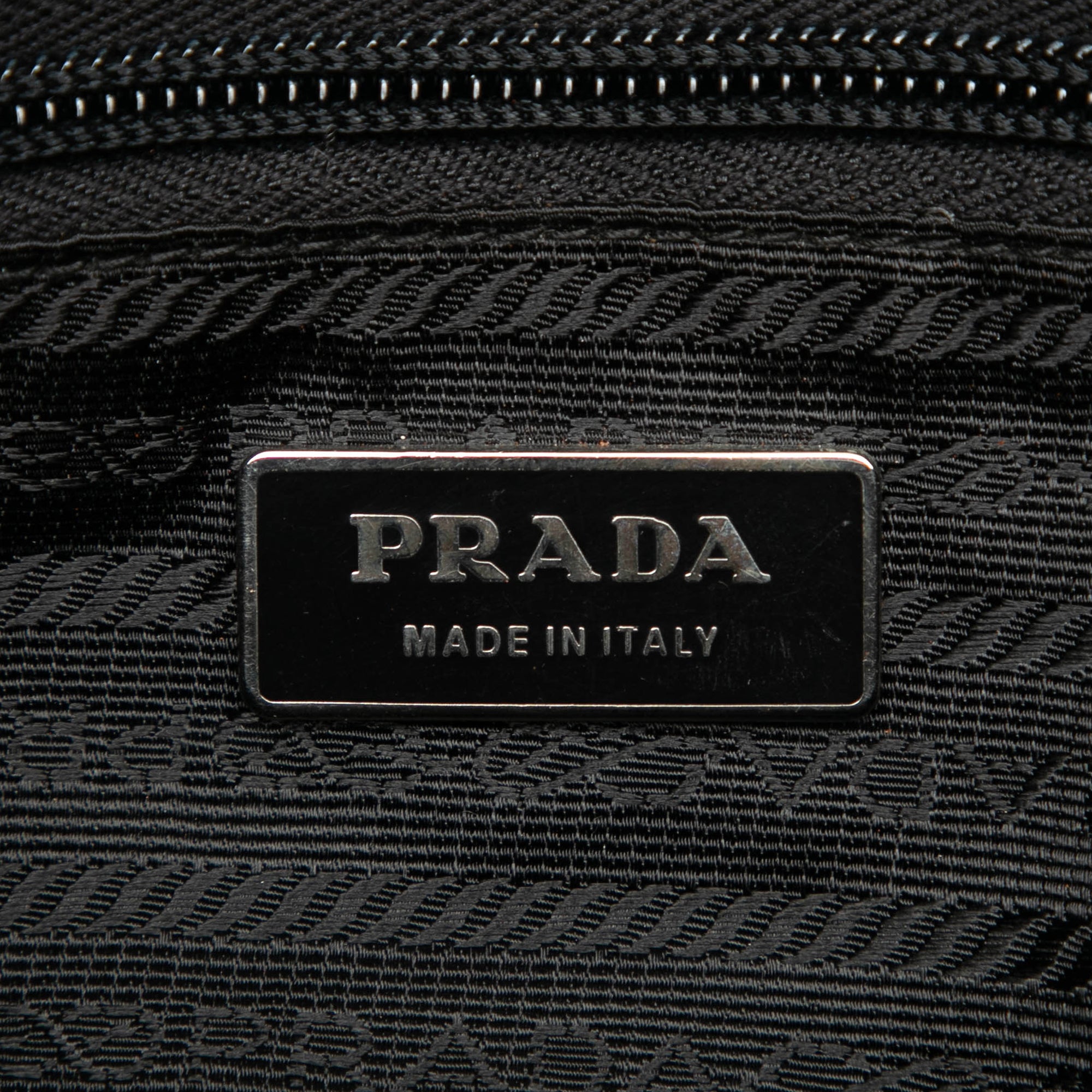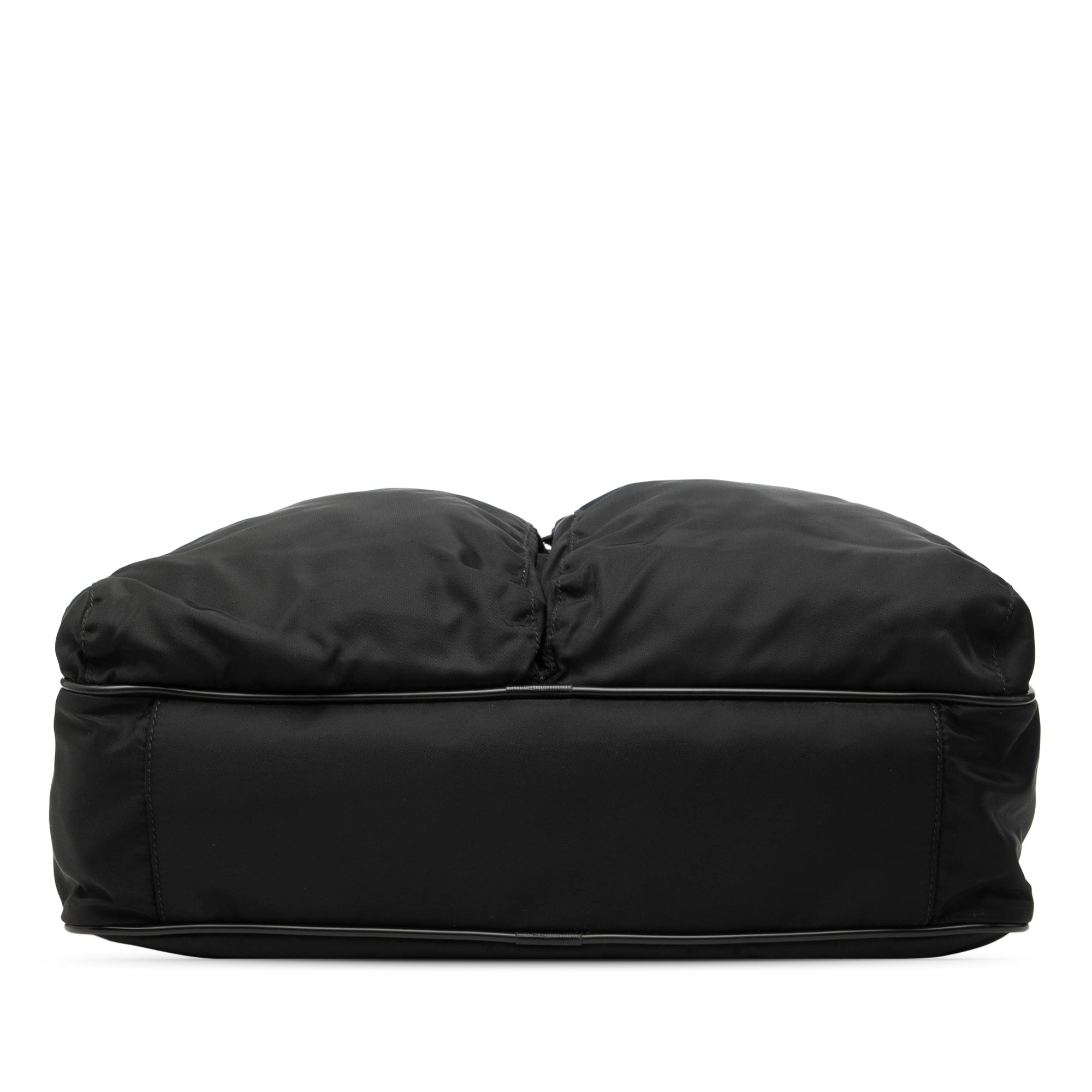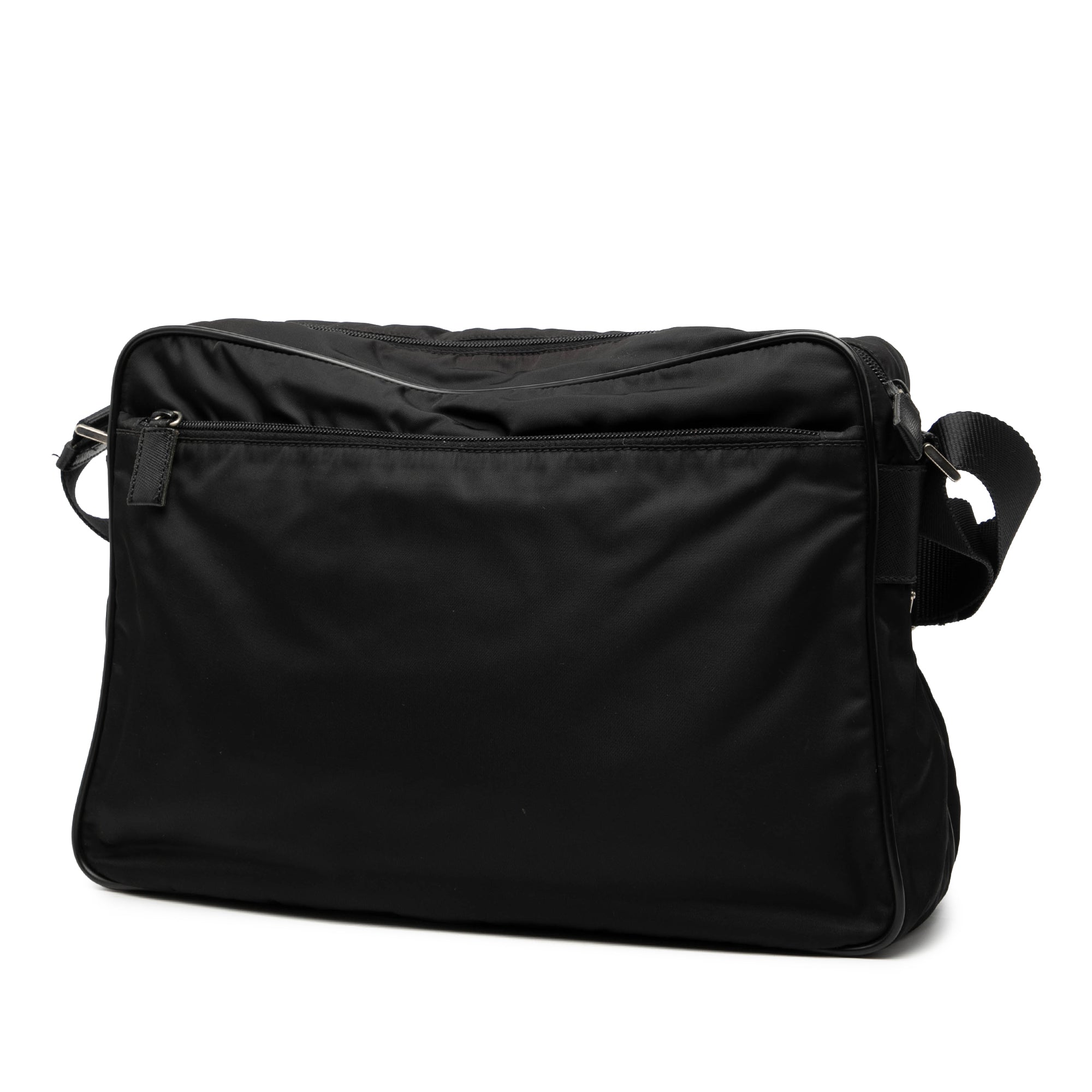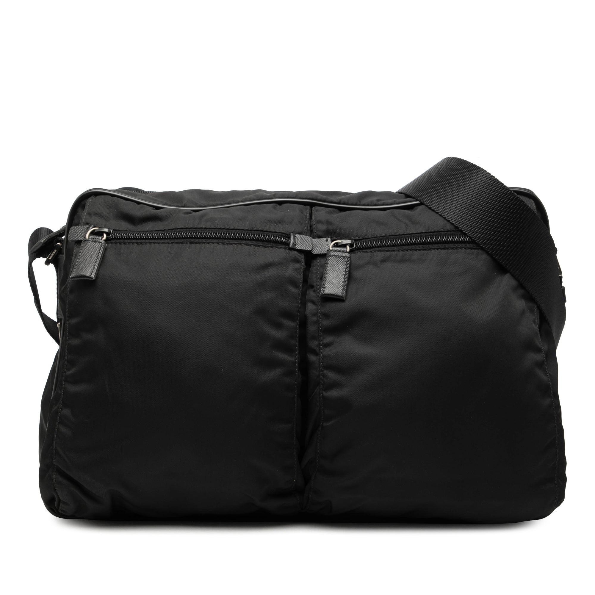 This crossbody bag features a nylon body with saffiano leather trim, an adjustable flat strap, a top zip closure, exterior zip pockets, and an interior zip pocket.