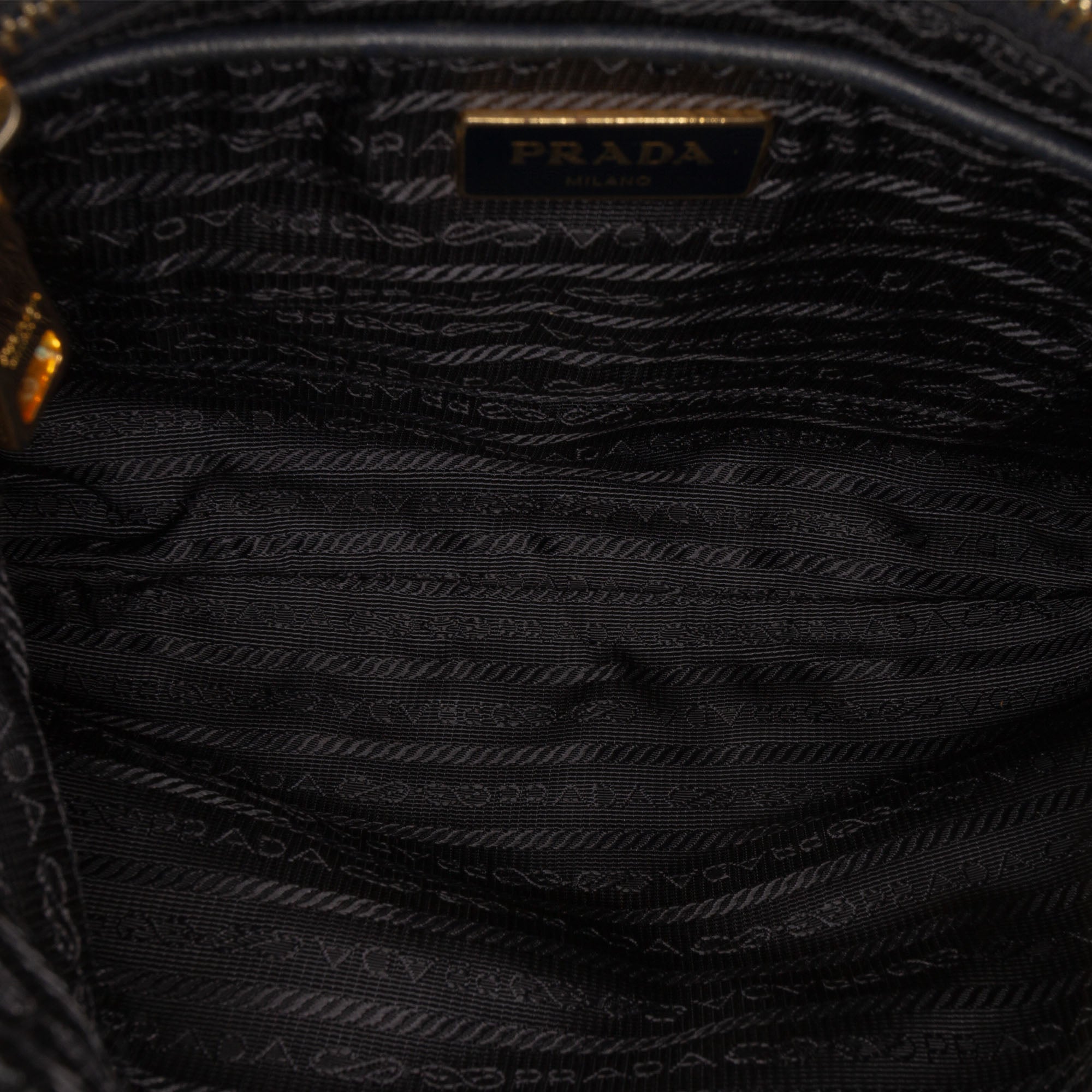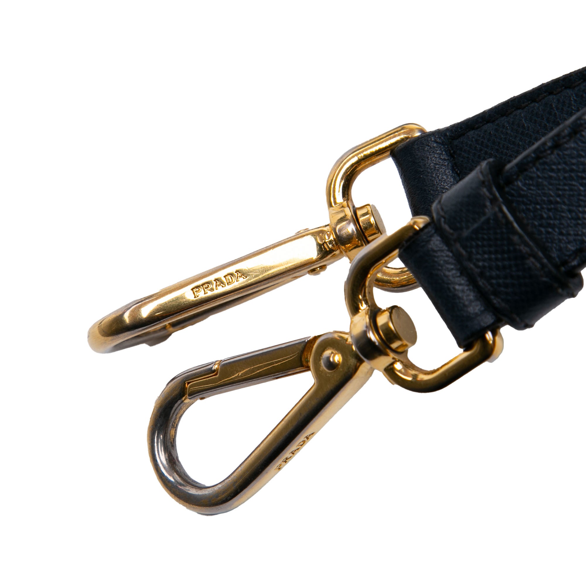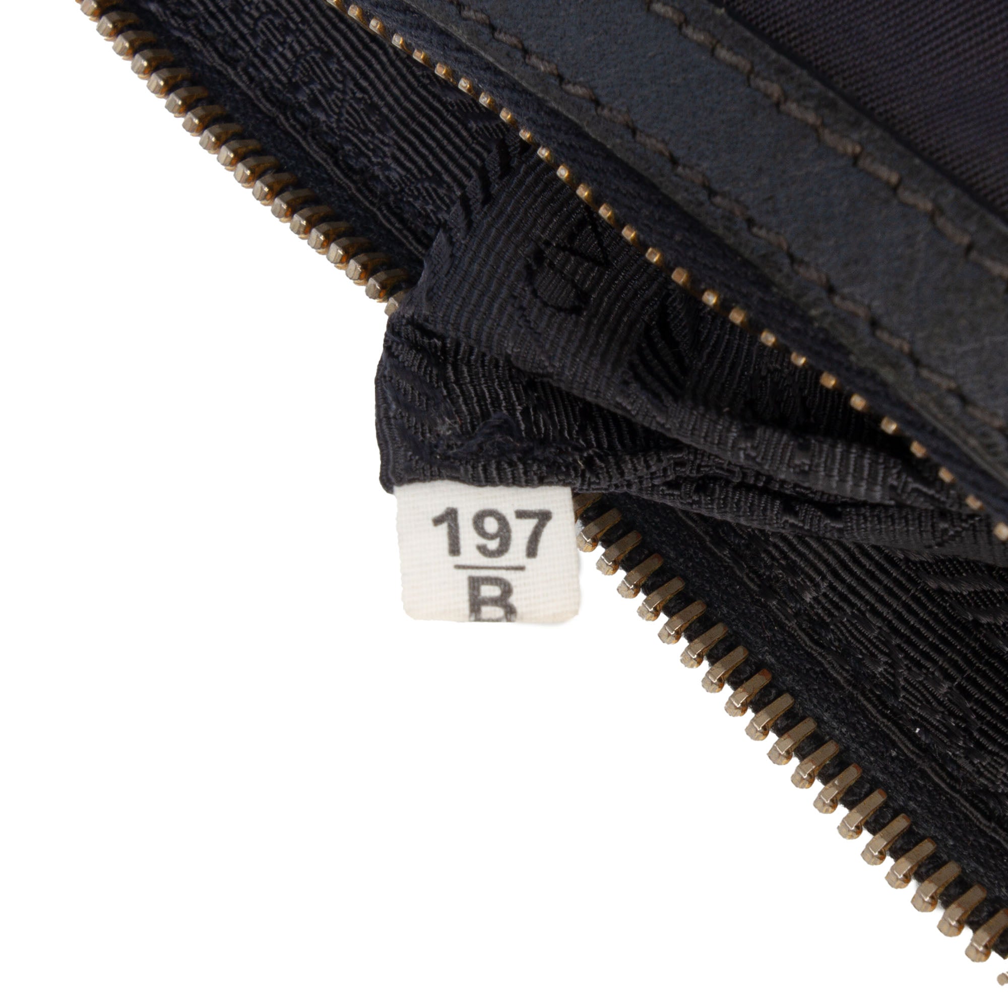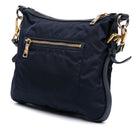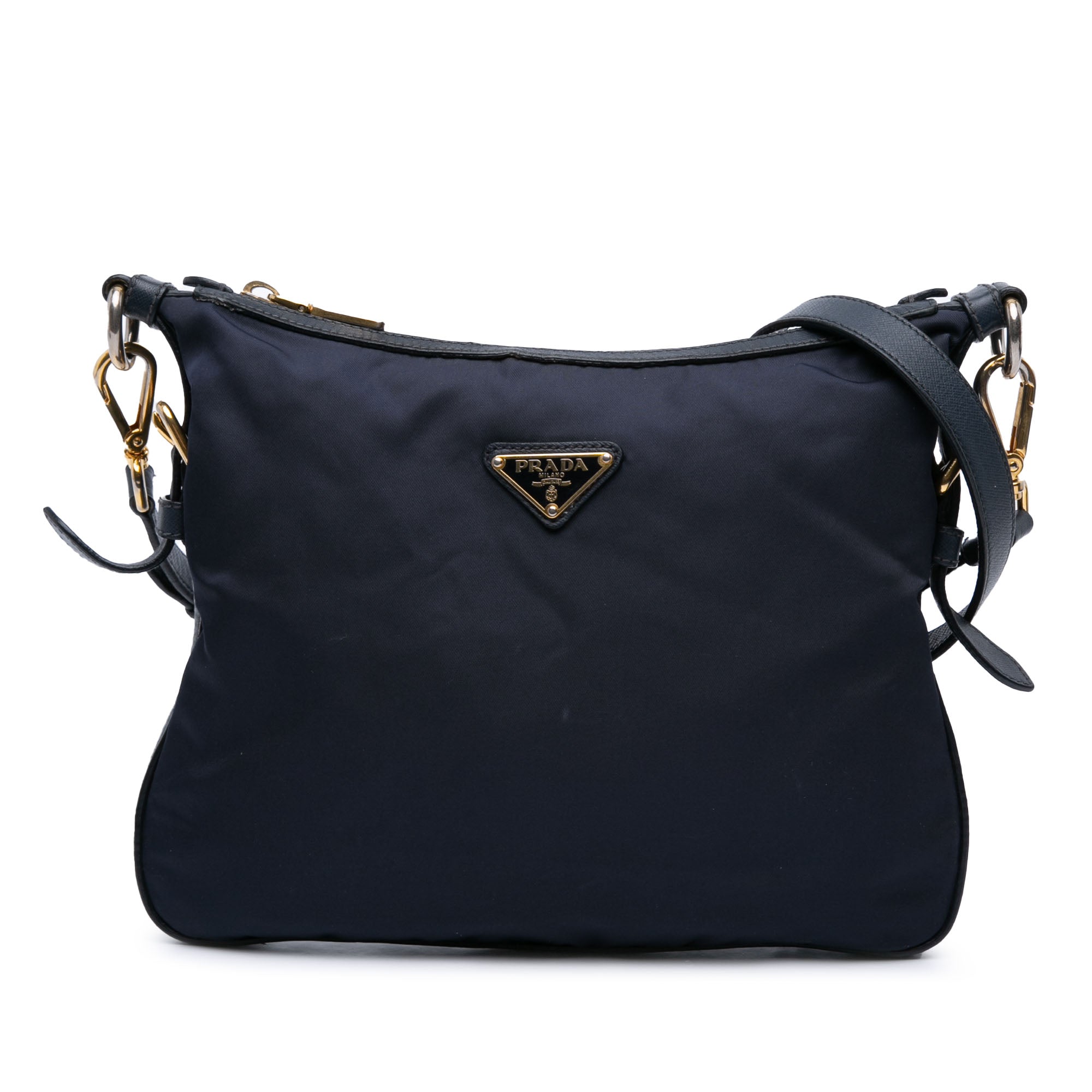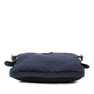 This crossbody bag features a nylon body with saffiano leather trim, an adjustable and detachable flat strap, a top zip closure, an exterior zip pocket, and interior zip and slip pockets.