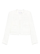 WHITE TWEED TEXTURE FRAYED EDGES OPEN FRONT PATCH POCKETS LONG SLEEVES